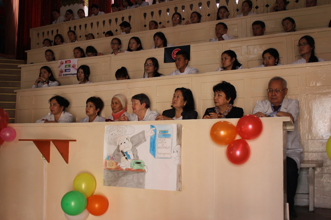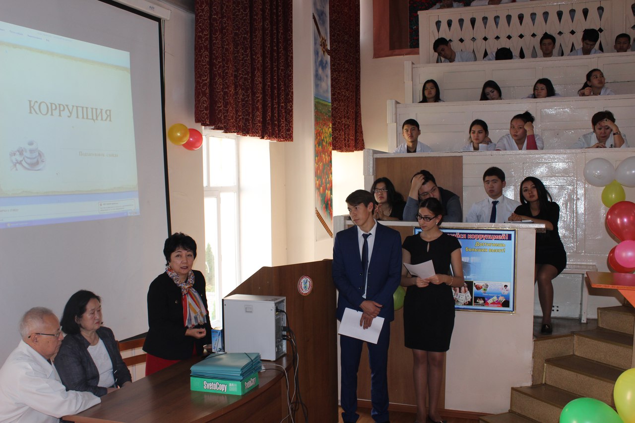 Особенно понравилась всем сценка «Коррупция в медицине» с участием студентовҚұлдыбай Әсем, Нурсеит Нуркен, Чәкен Ержан, Оразғалиева Назерке, Әбдікерім Балтөре, Ескендір Дина. Завершилось мероприятие викториной «Эрудит.Коррупция». Участникам были вручены грамоты, гости выразили благодарность организатораммероприятия.