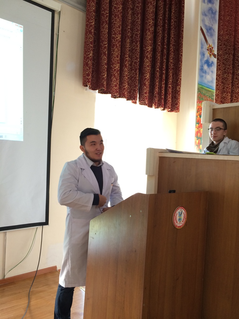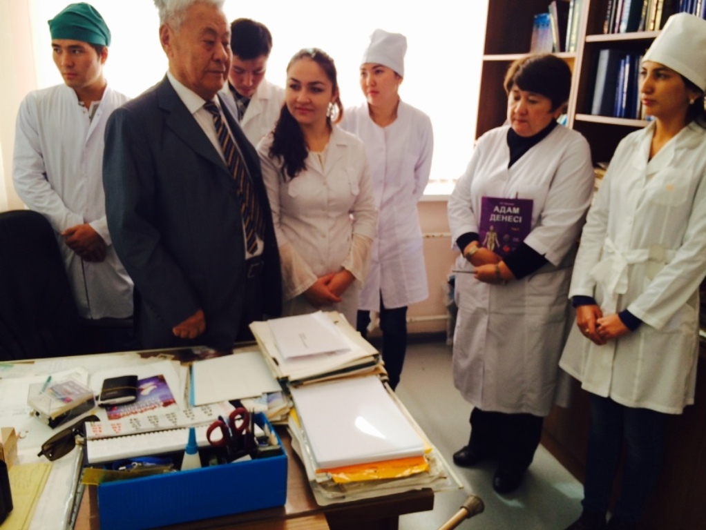Перед началом круглого стола студенты торжественно поздравили с праздником академика НАН РК, почетного заведующего кафедрой нормальной анатомии, д.м.н., проф. Рахишева А.Р.