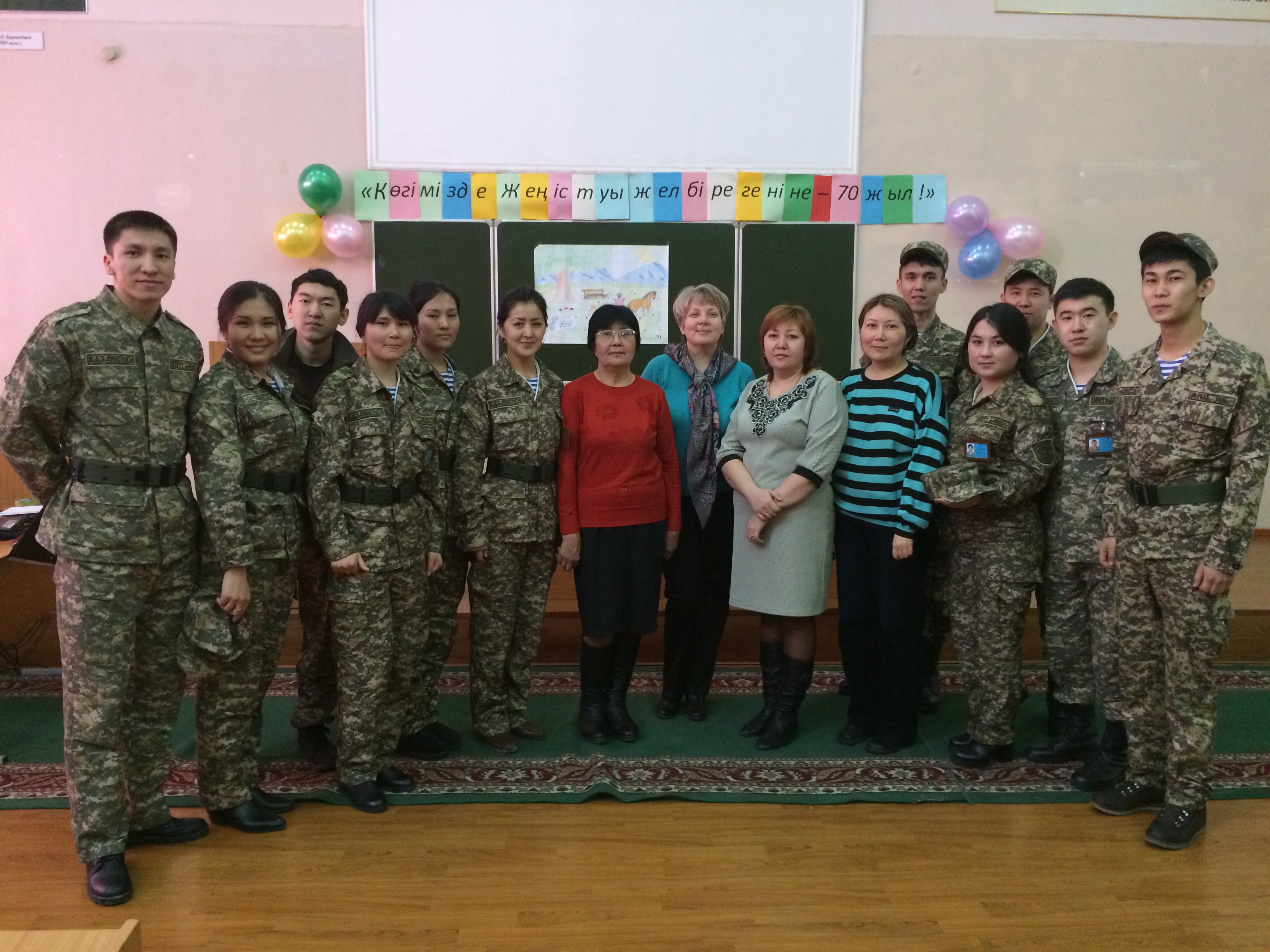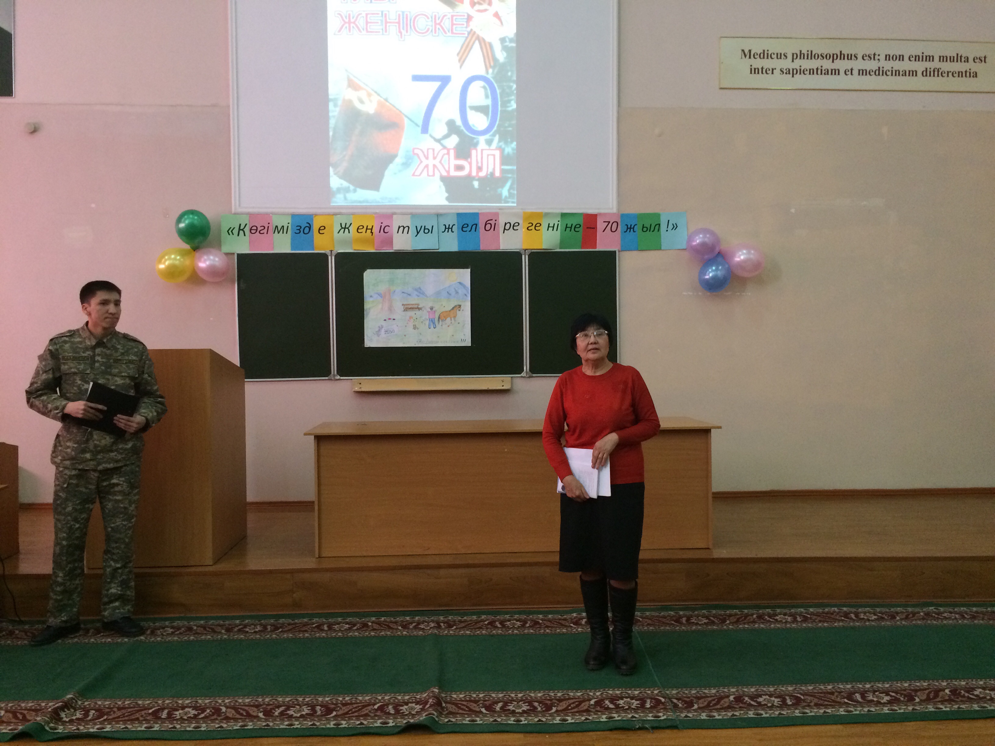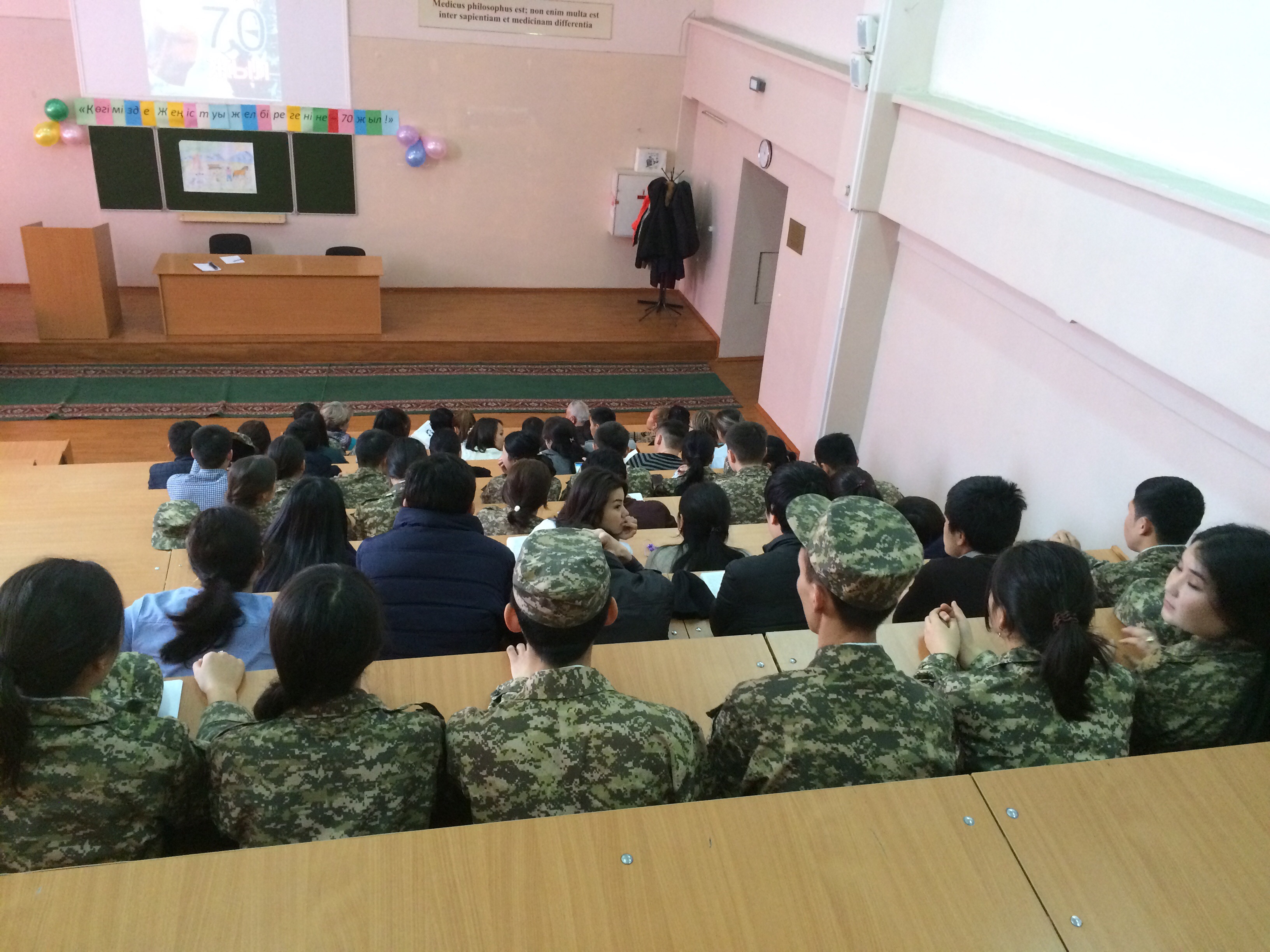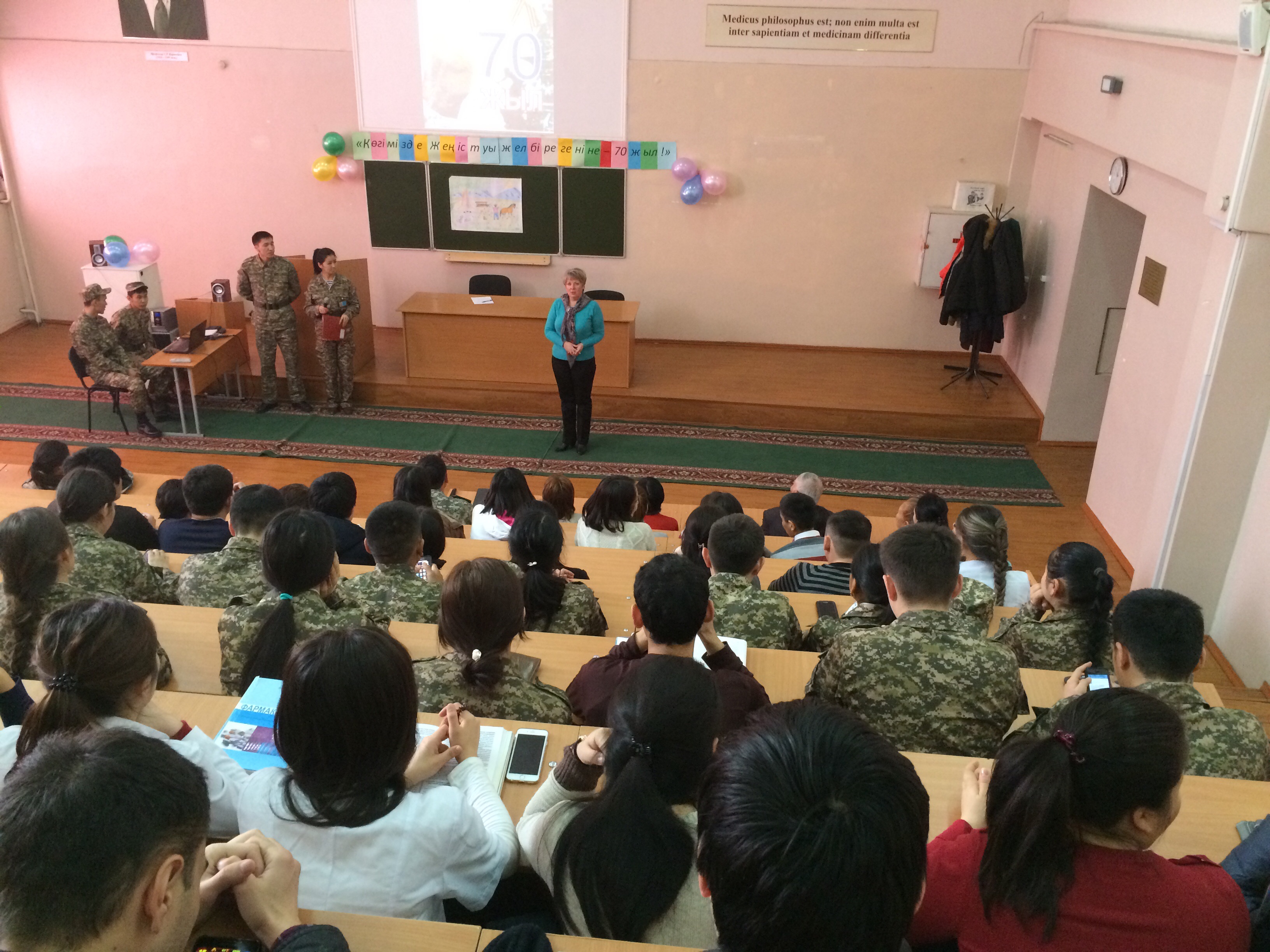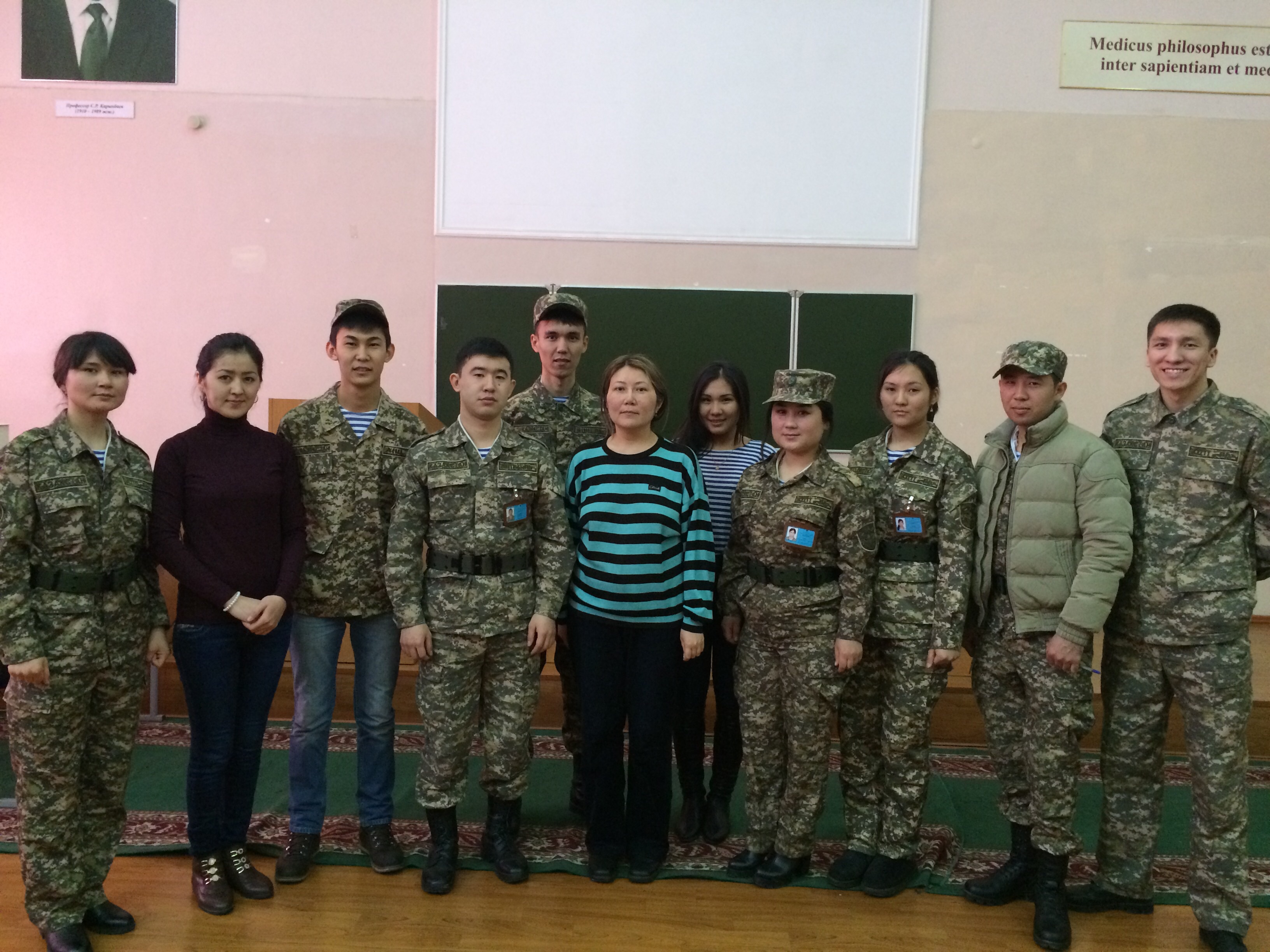 31 марта 2015 года студентами 12-027-01 группы III курса факультета «Общая медицина» под руководством ППС модуля нормальной физиологии для 100 студентов III курса факультета «Общая медицина» был организован и проведен вечер, посвященный 70-летию Славной Победы в Великой Отечественной Войне 1941-1945 гг. в аудитории №4 с приглашением проректора по учебно-воспитательной работе К.А.Тулебаева, директора департамента по развитию социально-культурных компетенций студентов Л.С.Шынгысбаева, начальника управления по социально-воспитательной работе М.Т.Султановой, директора департамента «Базовых дисциплин» К.К.Мустафиной, директора центра интегрированного обучения Г.М.Есенжановой, начальника ОП и КУП (учебная часть) К.Е.Куангалиевой, декана факультета «Общая медицина» Р.Т.Джумашевой, сотрудников деканата факультета «Общая медицина»: заместителя декана по воспитательной работе Ж.Ж.Курмангалиевой, заместителя декана 3 курса К.Т.Кашагановой, руководителя модуля гистологии Н.М.Тусуповой, старшего преподавателя военной кафедры, подполковника медицинской службы А.Т.Лесбаева. Ответственные за мероприятие и студенты 12-027-01 группы III курса факультета «Общая медицина» расширили знания студентов о военной истории; о трудностях боевого времени, развитие духовно–нравственного, эстетического воспитания, формирование представлений о Великой Отечественной Войне, о значении Курской битвы в Великой Отечественной войне, развитие памяти, речи, художественного, музыкального вкуса студентов, воспитание чувства патриотизма, гордости за свою страну, ответственности за свою Родину, воспитание чувства прекрасного, что и явилось целью проведенного вечера.