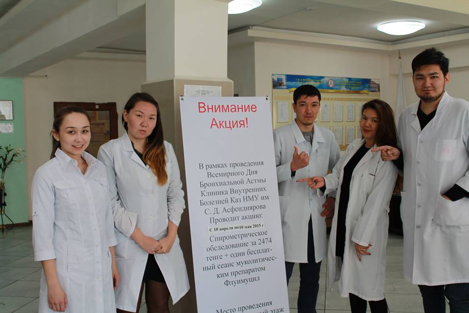 О проведении акции были информированы Управление здравоохранения г. Алматы и поликлиники города. На клинической конференции кафедра подготовила доклад по данным международного руководства Глобальной Инициативы по Астме (GINA, 2014 г.). Присутствовало 35 врачей клиники. За период акции проконсультировано 32 пациента, включая студентов КазНМУ и энергетического института, проведено 21 спирометрическое исследование и столько же сеансов небулазерной терапии с препаратом «Флуимуцил».