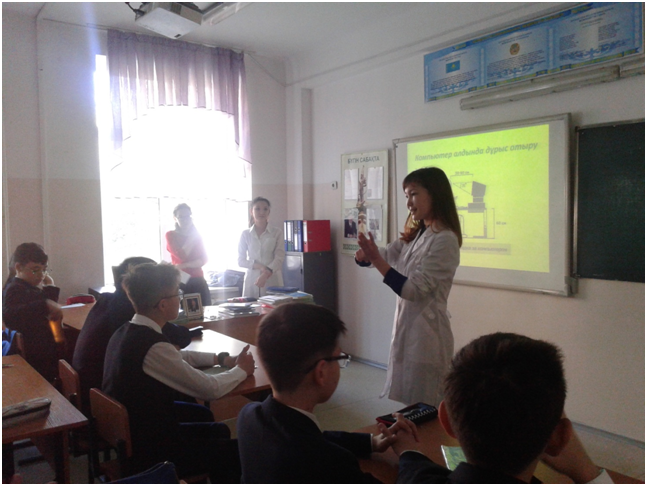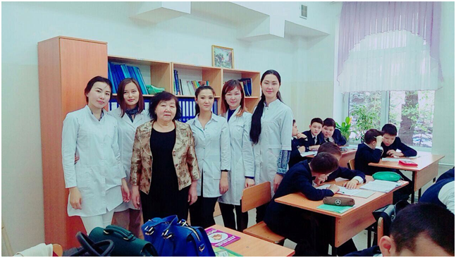 25 апреля 2017 года студентами 5 курса «Обшей медицины» была проведена воспитательная работа с учениками в специализированном лицее № 39-имени С.А. Ходжикова по заявке директора Жумалиева М.С. С докладом выступили студенты факультета «Общей медицины» 17-1 группы Қуатбек Малика и Нахаева Ұлданай в 9 «А» классе на тему: «Социально-психологические последствия употребления наркотиков и психоактивных веществ». Доклад на тему: «Здоровый образ жизни» подготовила студент факультета «Общей медицины» 20-1 группы Әбуғалиева Назерке для учеников 6 «А» класса. Тұрлықожаев Абзал студент 22-2 группы выступил с докладом о профилактике заболеваний опорно-двигательной системы под названием: «Движение – это жизнь». Студент 21-1 группы Абилкаир Ерлан прочитал доклад на тему «Закономерности развития детского и подросткового организма, гигиена подростков для учеников 7 и 8 классов.