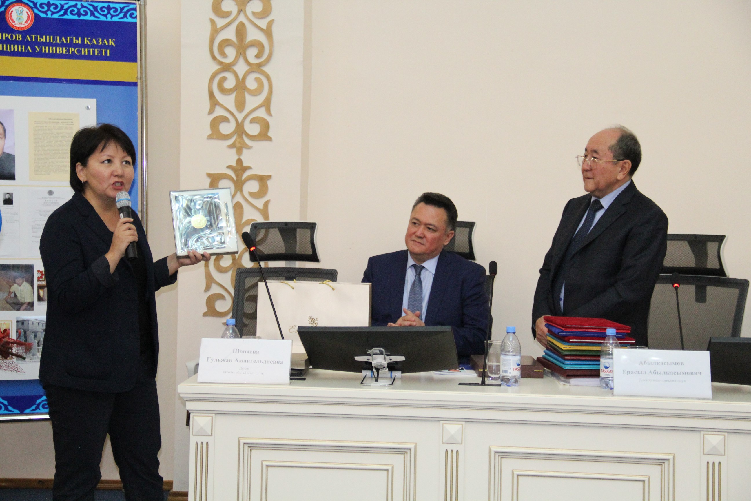 С поздравительным словом выступил ректор КазНМУ им.С.Д.Асфендиярова д.м.н., профессор Нургожин Т.С., а также гости — ректор Казахско-Российского медицинского университета д.м.н., профессор Джайнакбаев Н.Т., директор филиала фонда социального медицинского страхования по г.Алматы, д.м.н. профессор Абильдаев Т.Ш.