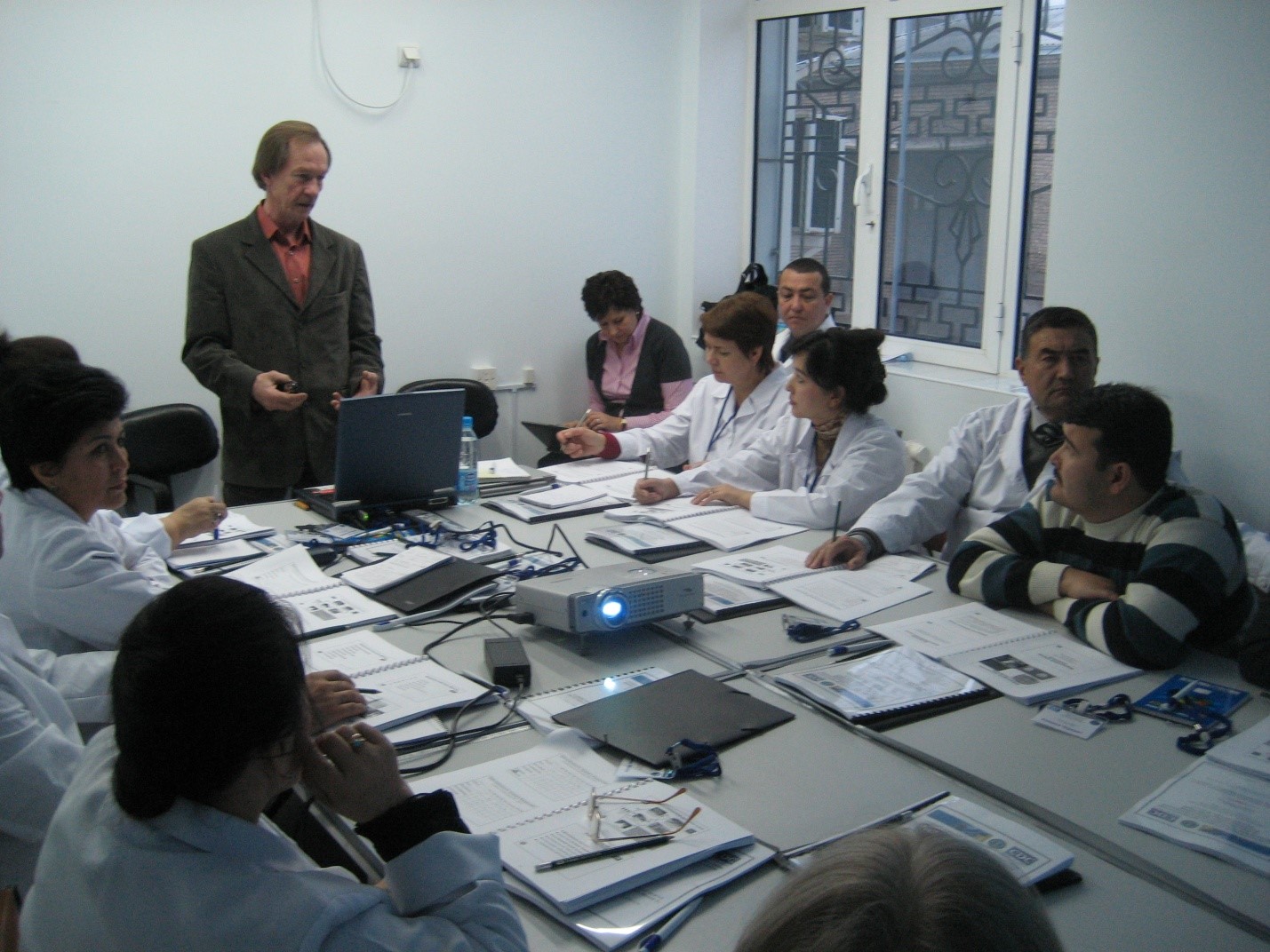 Проф.Дмитровский А.М. проводит тренинг с курсантами обучающего курса Центрально-Азиатского офиса CDC «Стандартные определения случая особо опасных инфекций».