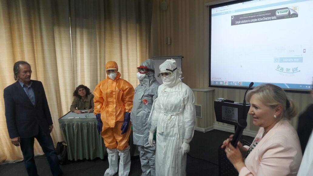 Сотрудники кафедры на Масер-классе «Алгоритм мероприятий при выявлении больного особой опасной инфекцией» (Алматы, 2017 г.)