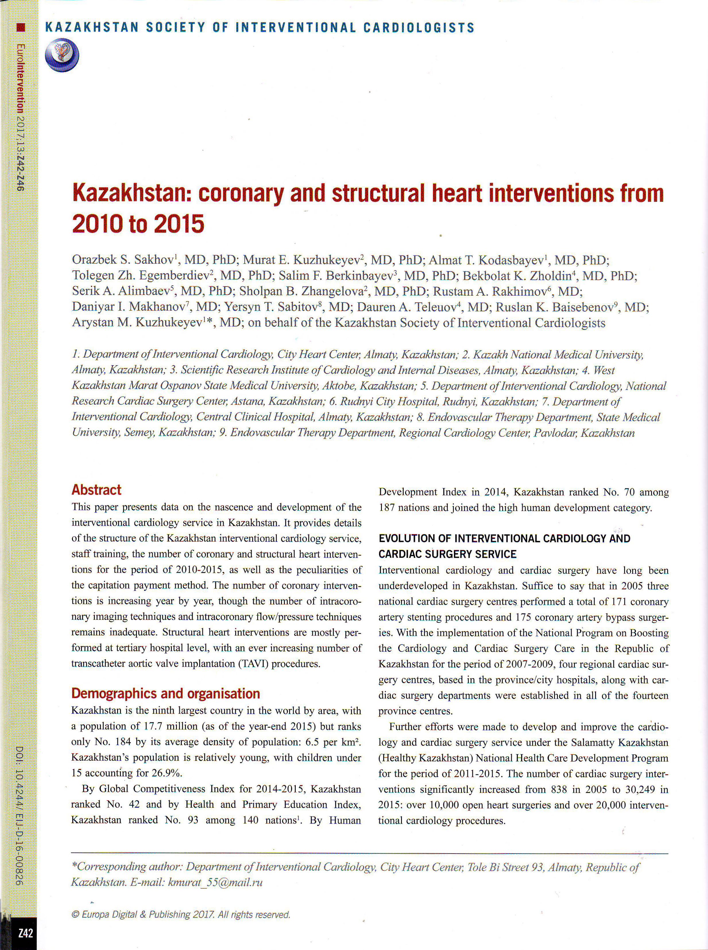 При непосредственном участии и руководстве М.Е. Кужукеева впервые в истории ГКЦг. Алматы в дни Конгресса вышла публикация (национальный регистр) на английском языке“Kazakhstan: coronary and structural heart interventions from 2010-2015” в журнале Euro Intervention Supplement (May, 2017), где наряду с другими 15 странами Европы мы представили данные о становлении и сегодняшних достижениях казахстанской интервенционной кардиологии.