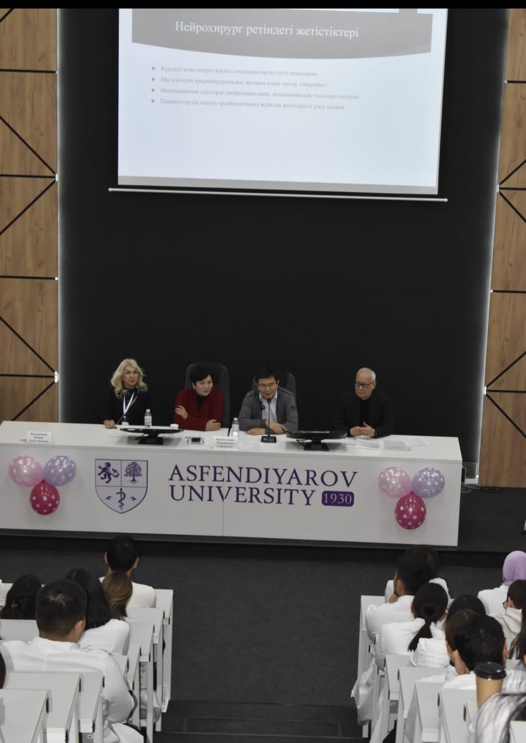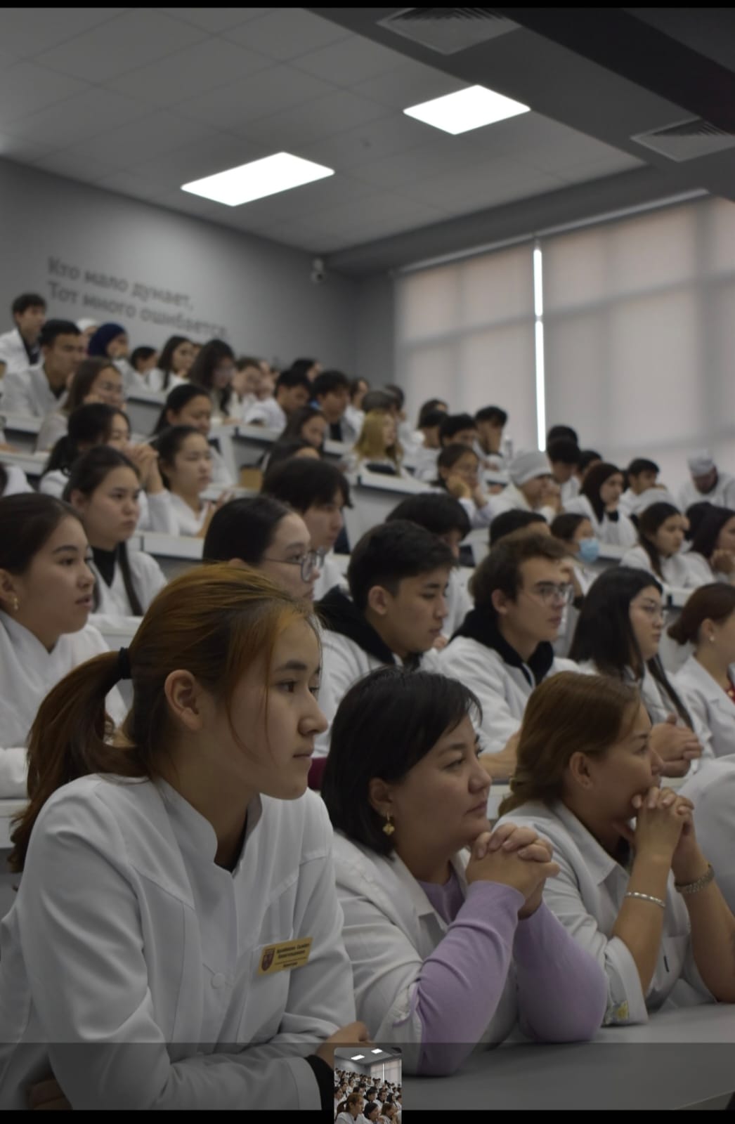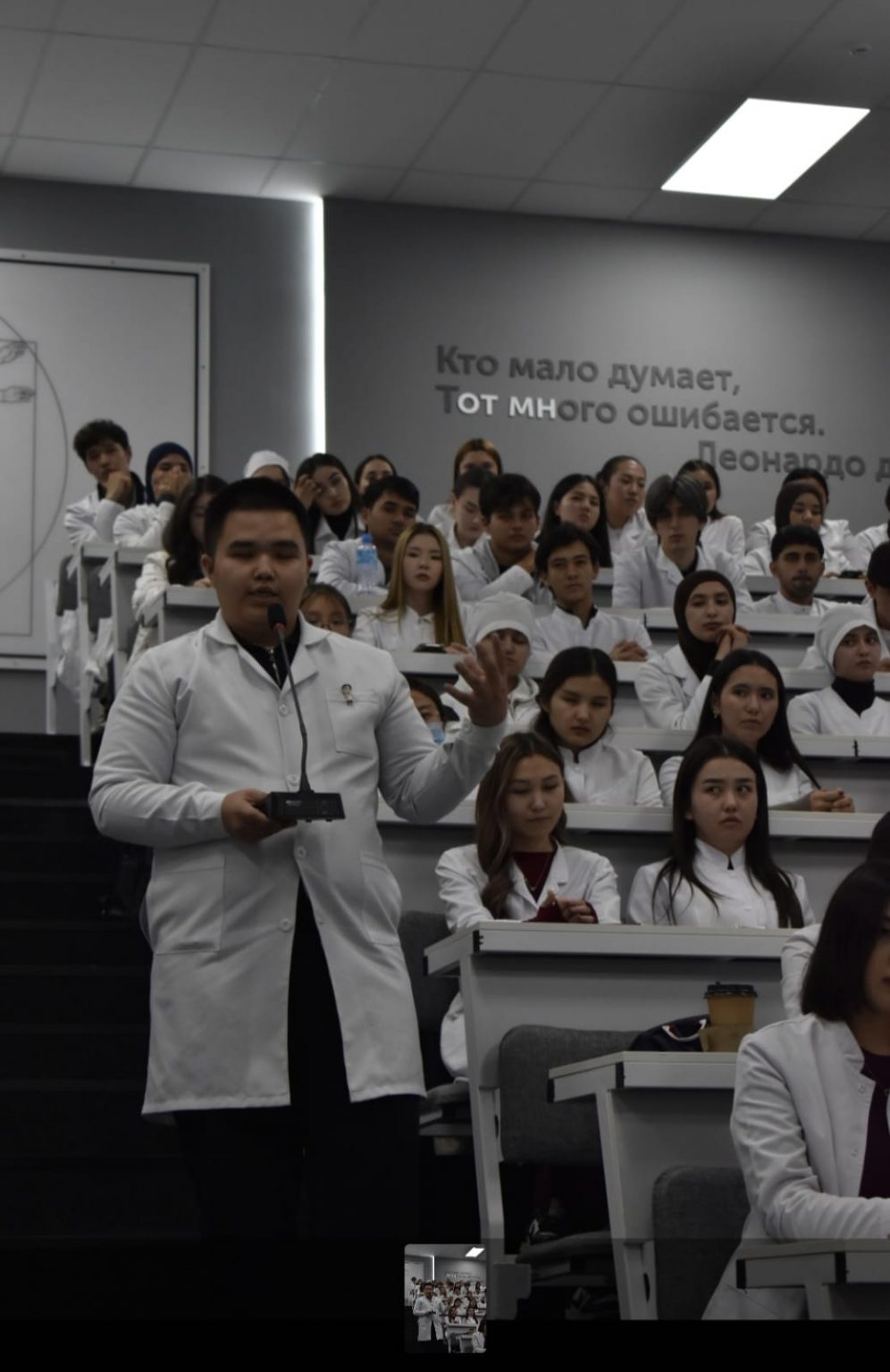 7 октября 2025 года в 7-й аудитории учебного корпуса №7 по инициативе кафедры нормальной анатомии имени С.Р. Карынбаева, в частности, заведующей кафедрой Ахмад Н.С., Досаева Т.М., Кенбаевой С.Р., Абиыровой Н.Б., Искаковой Л.А., Искиндировой А.М., Охановой М.И., Уважановой А.С., Абиловой А.А., Куатбековой А.К., в соответствии с утвержденным планом воспитательной работы была организована мотивационная встреча с известным нейрохирургом, магистром общественного здравоохранения, вице-президентом Национальной медицинской ассоциации Бердиходжаевым Мынжылкы Сайлаулы. Формат встречи был представлен в виде подкаста. Главная цель мероприятия- познакомить студентов с личностью, добившейся успеха в области медицины и проложить путь к становлению личности из числа сильных профессионалов.