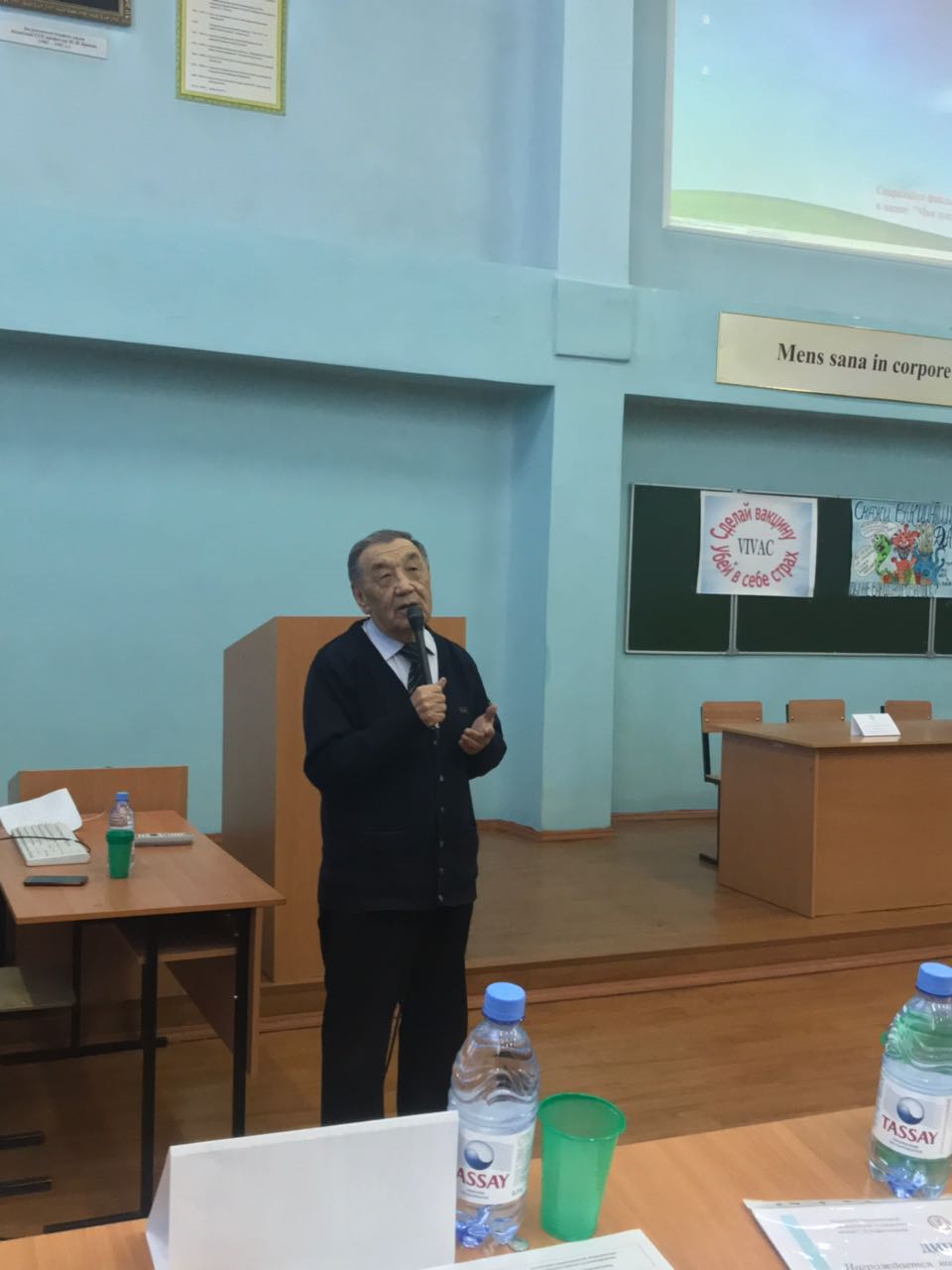 С приветственным словом выступил руководитель Школы вакцинологии КазНМУ им.С.Д.Асфендиярова Амиреев С.А., профессор кафедры эпидемиологии.