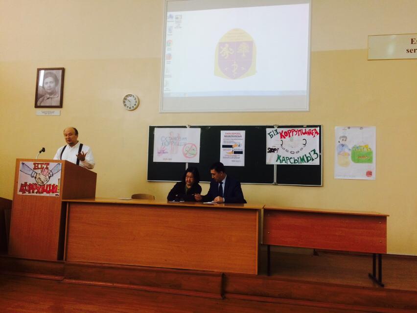 Следующий докладчик, заведующий кафедрой химии, д.х.н., профессор Мырзакожа Д.А. рассказал о том, что химический термин энтропия связан с коррупцией нашего общества. Энтропия – мера беспорядка и характеристика состояния. Визуально, чем более равномерно расположены вещи в некотором пространстве, тем больше энтропия. К примеру, если сахар лежит в стакане чая в виде кусочка, энтропия этого состояния мала, если растворился и распределился по всему объему – велика. Беспорядок можно изменить, например, посчитав сколькими способами можно разложить предметы в заданном пространстве (энтропия тогда пропорциональна логарифму числа раскладок). Также и в нашей с Вами жизни, есть беспорядок, те, кто дает или берет взятку и нужно искоренять коррупцию, чтобы не было хаоса и все было равномерно и ровно во всех наших отношениях, в отношениях между преподавателем и студентом, между врачом и пациентом.