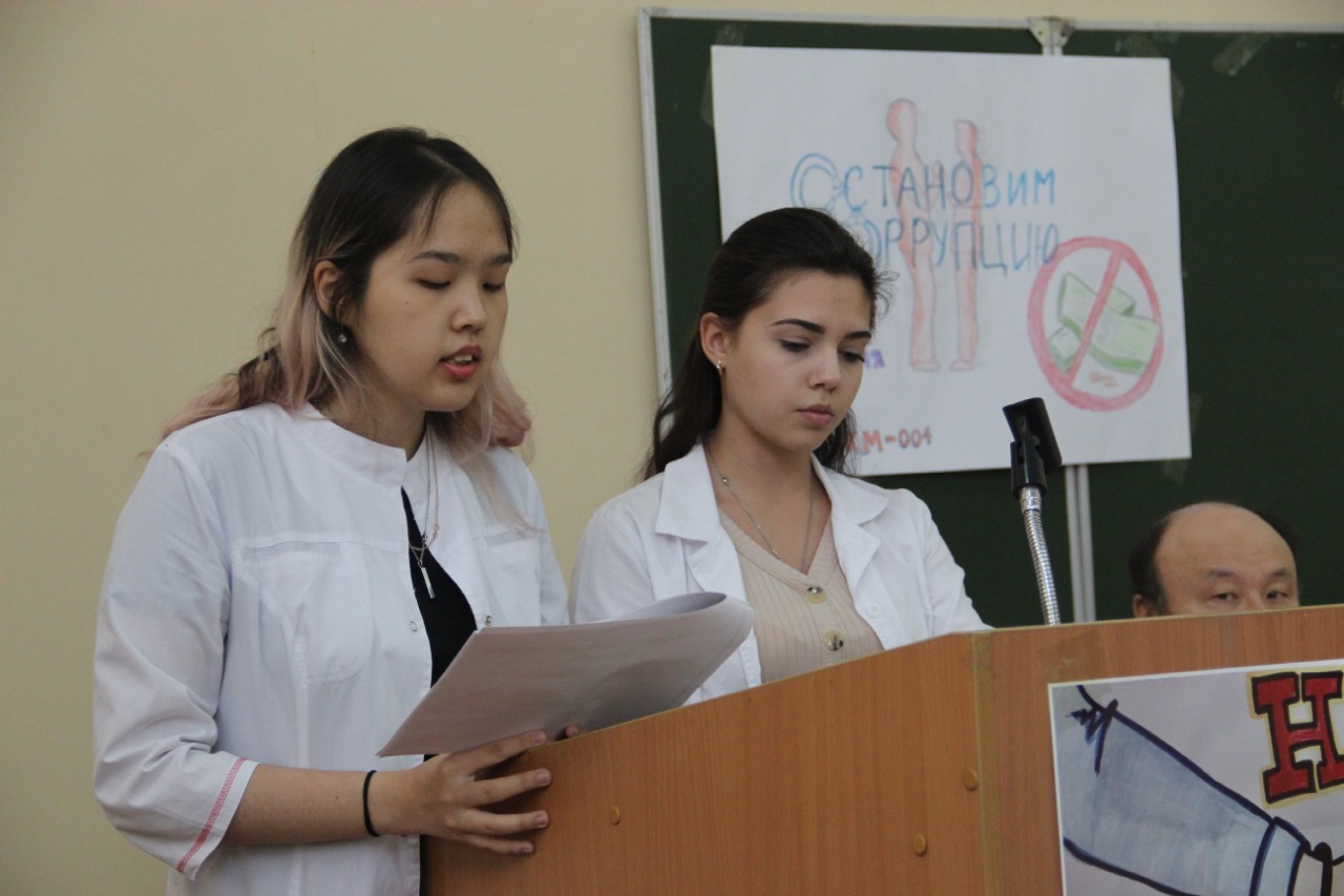 Также своим мнением поделились и присутствующие в аудитории студенты. Выступление студента 3 курса Школы Фармации 17-001-02 Ахметова Д. сопровождалось показом видеофильма «Коррупция грабит Вас или …?». Согласно которому, коррупция зародилась уже давно и известны исторические личности, которые были авторами первых законов по борьбе с коррупцией. Студентка 3 курса Школы Фармации 17-001-02 к Есенжолова А. рассказала про «Коррупцию в Казахстане», о необходимости  бороться с ней. После этого выступили студентки 2 курса Школы  Общей Медицины 18-026-01р Жумабек А. и Караваева Д. Они рассказали «Об академической честности», в нашем университете. Эти программы принимаются в каждом университете и медицинские Высшие школы не являются исключением. Они призвали, чтобы студенты-медики хорошо учились и став в будущем врачами оказывали качественную медицинскую помочь.