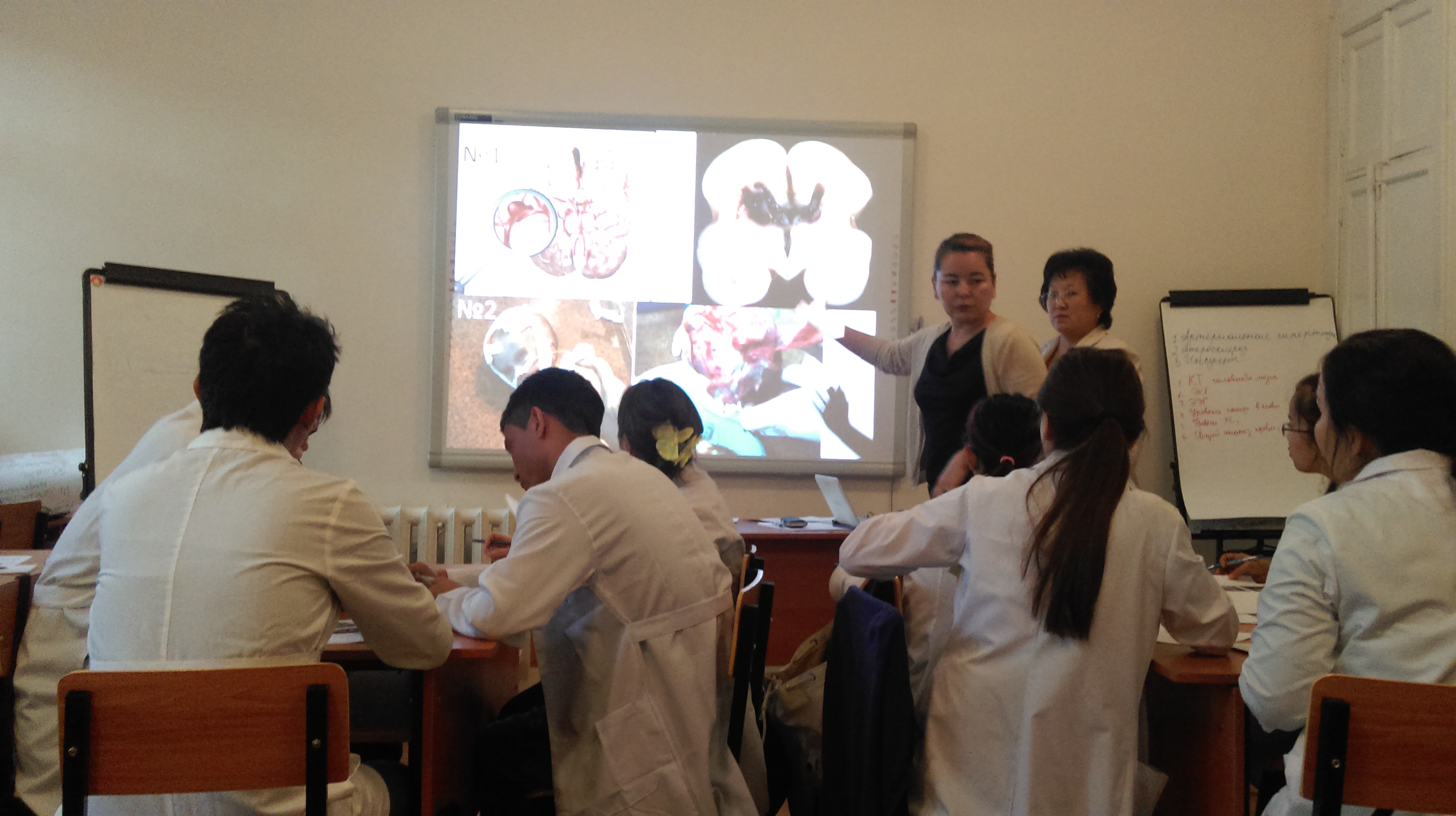 С 25.08. по 10.09.14г. профессорско-преподавательский состав кафедр и модулей, входящих в центр интегрированного обучения, прошли повышение квалификации по активным методам преподавания. В рамках повышения квалификации сотрудниками разработано методическое обеспечение по 6 темам, необходимые для занятий одним из интерактивных методов по модулю «Нервная система» со студентами 3 курса факультета общей медицины. Так, доцентом кафедры пропедевтики внутренних болезней А.К. Ижановой проведен разбор клинического случая на тему: «Головокружение» в течение 3-х занятий проблемно-ориентированным методом. Проведено интегрированное занятие по дисциплинам фармакология и патологическая физиология в виде разбора кейса по теме: «Нарушение мозгового кровообращения» руководителем модуля фармакологии доц. Айтжановой Г.Б., Изатовой А.Е. совместно с руководителем модуля патологической физиологии доц. Толепбергеновой М.Ж., Ермаганбетовой А.Ш., был применен метод CBL — обучение на основе клинического случая. Также занятия проводили командным методом (ТBL) сотрудники модуля гистологии (к.б.н. Тусуповой Н.М., Мулькибаевой Ш.Ш., Алсеитовой Ф.Д.) на государственном языке, преподаватели модулей нормальной физиологии (к.м.н. Росляковой Е.М., доцент Бисеровой А.Г.) и нормальной анатомии (доцент Исабековой У.А.) и патологической анатомии (к.м.н. Искаковой Э.Е., Анаятовой Б.Ж., Серикбай М.К.) на русском языке. На занятиях присутствовали все сотрудники, проходящие повышение квалификации. После каждого занятия проводился дебрифинг, разбирались преимущества, недостатки занятия, даны рекомендации для повышения качества занятия.