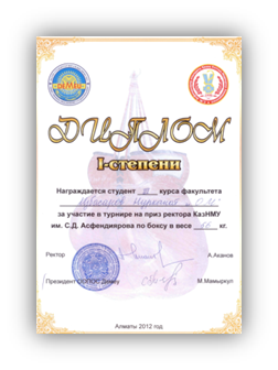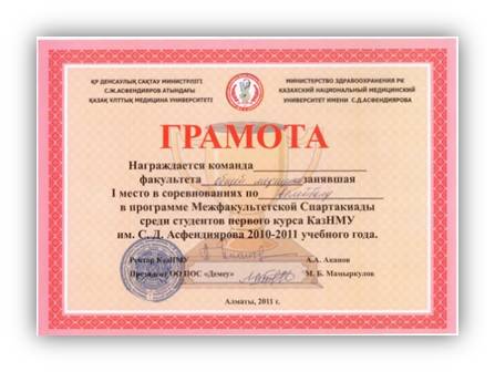 Студенты факультета общей медицины участвуют в спортивных мероприятиях, межфакультетских спартакиадах, чемпионатах города и страны, в составе сборных команд. Наши студенты-спортсмены, занимают призовые места не только на уровне республики, но и на международных соревнованиях. Призовые места отмечены кубками, медалями и грамотами. Всего за 3 года завоевано 25 кубков, 125 грамот, 15 медалей на соревнованиях и спартакиадах различного уровня по волейболу, баскетболу, футболу и т.д. Например, команда факультета общей медицины завоевала диплом І степени по боксу в турнире на приз ректора КазНМУ; Избасаров Нурканат – диплом І степени по боксу в турнире на приз ректора КазНМУ; Аманов Дастан — 2 место на первенстве г. Алматы по пауэрлифтингу; Рахимова Гаухар – диплом за 2 место на республиканской IV зимней универсиаде по пауэрлифтингу г. Астана; Дусенгалиева Фариза – диплом за 2 место на республиканской IV зимней универсиаде по пауэрлифтингу в г. Астана; Султан Мархаббат – 3 место в республиканском соревновании по «қазақша күрес» в г. Семей; Елхан Елжас – 3 место в республиканском соревновании по «қазақша күрес» в г. Семей; Ризаев Рафаэль – 3 место на VI летней республиканской универсиаде по кикбокингу в г. Астана; Межфакультетской спартакиаде среди студентов заняли 1 место – грамота КазНМУ; Межфакультетской Спартакиаде среди студентов заняли 1 общекомандное место по волейболу — грамота КазНМУ;