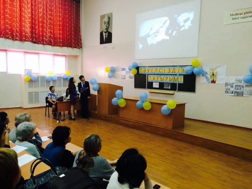 24 ноября 2015 года студентами 13-028-01 группы III курса факультета «Общая медицина» под руководством ППС модуля нормальной физиологии был организован и проведен праздник, посвященный Дню Независимости Республики Казахстан «Тәуелсіздік – тұғырым» в аудитории №4 с приглашением проректора по учебно-воспитательной работе К.А.Тулебаева, начальника управления по воспитательной и социальной работе М.Т.Султановой, директора департамента «Базовых дисциплин» К.К.Мустафиной, директора центра интегрированного обучения Г.М.Есенжановой, начальника ОП и КУП (учебная часть) К.Е.Куангалиевой, декана факультета «Общая медицина» Р.Т.Джумашевой, сотрудников деканата факультета «Общая медицина»: заместителя декана 3 курса и по воспитательной работе Ж.Ж.Курмангалиевой, руководителя модуля гистологии Н.М.Тусуповой. Ответственные за мероприятие и студенты 13-028-01 группы III курса факультета «Общая медицина» показали обычаи, национальную одежду и украшения казахского народа, любовь к Родине, чувство патриотизма, что и явилось целью проведенного вечера.