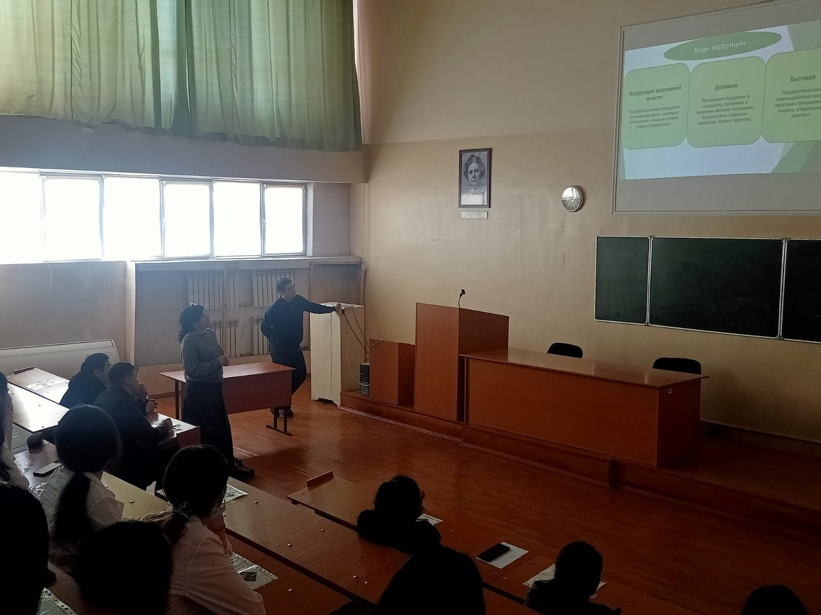 Іс-шараға «Медициналық құқық» кафедрасының меңгерушісі Л.Б. Богатырева қатысты. Л.Б. Богатырева студенттерге қандай құқықтық жауапкершілік және «ҚР жемқорлыққы қарсы іс-қимыл туралы» – атты заңын және оның негізігі мақсаты сыбайлас жемқорлыққа қарсы іс-қимыл саласындағы қоғамдық қатынастарды реттейді және Қазақстан Республикасында сыбайлас жемқорлыққа қарсы саясатты іске асырады деп атап өтті. студенттерге егжей-тегжейлі түсіндіріп берді. Сондай – ақ Л.Б. Богатырева Сыбайлас жемқорлықты қабылдау индексі Transparency International халықаралық мемлекеттік емес ұйымымен талдаушылар мен кәсіпкерлердің сыбайлас жемқорлықты қабылдау деңгейін бағалауды көрсету мақсатында жасалатын осы соңғы 2020 жылдағы көрсеткіштерін баян етті.
