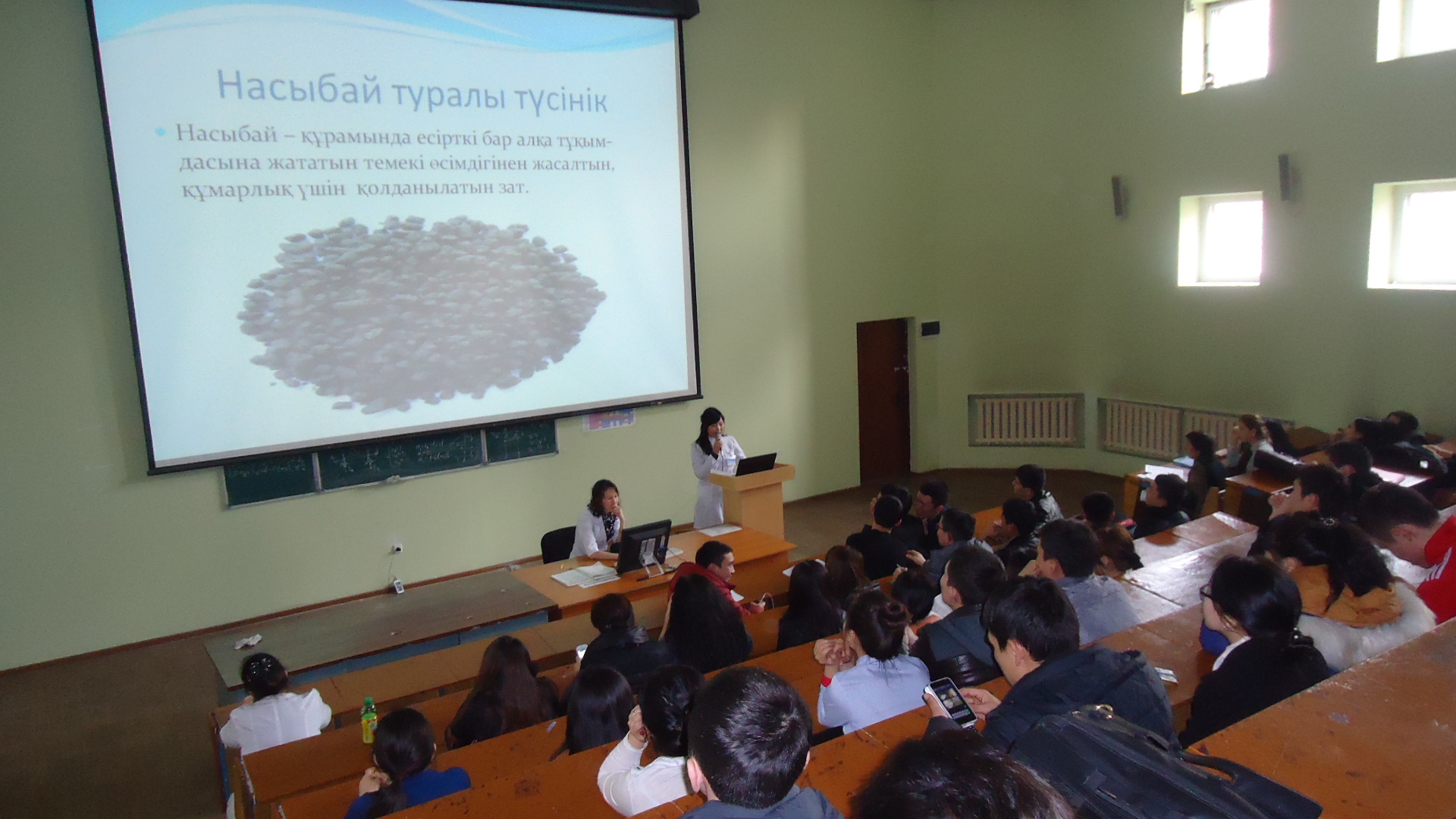 По плану воспитательной работы студенты, обучающиеся на цикле «Пульмонология» кафедры внутренних болезней № 4 самостоятельно готовят сообщения о вреде привычек курения и употребления насвая. С самыми лучшими из этих работ они выступают перед своими сверстниками в других высших учебных заведениях города. Так, 13 марта 2014г. совместно со старшим наставником ассистентом Шишкаевой Д.С. студенты 5 курса 046-1 группы Әлібаева Анар и Искакова Назерке выступили в КазНТУ им. К. Сатпаева, а 14 марта студенты 4 курса 050-1 группы Джолдыбаева Айжан – в КазНУ им.Аль-Фараби на факультете журналистики с ответственным по воспитательной работе стажером-преподавателем Жамировой Р.Н. Отличное знание материала сопровождаемое показом короткометражных социальных роликов вызвало активную дискуссию у их сверстников.