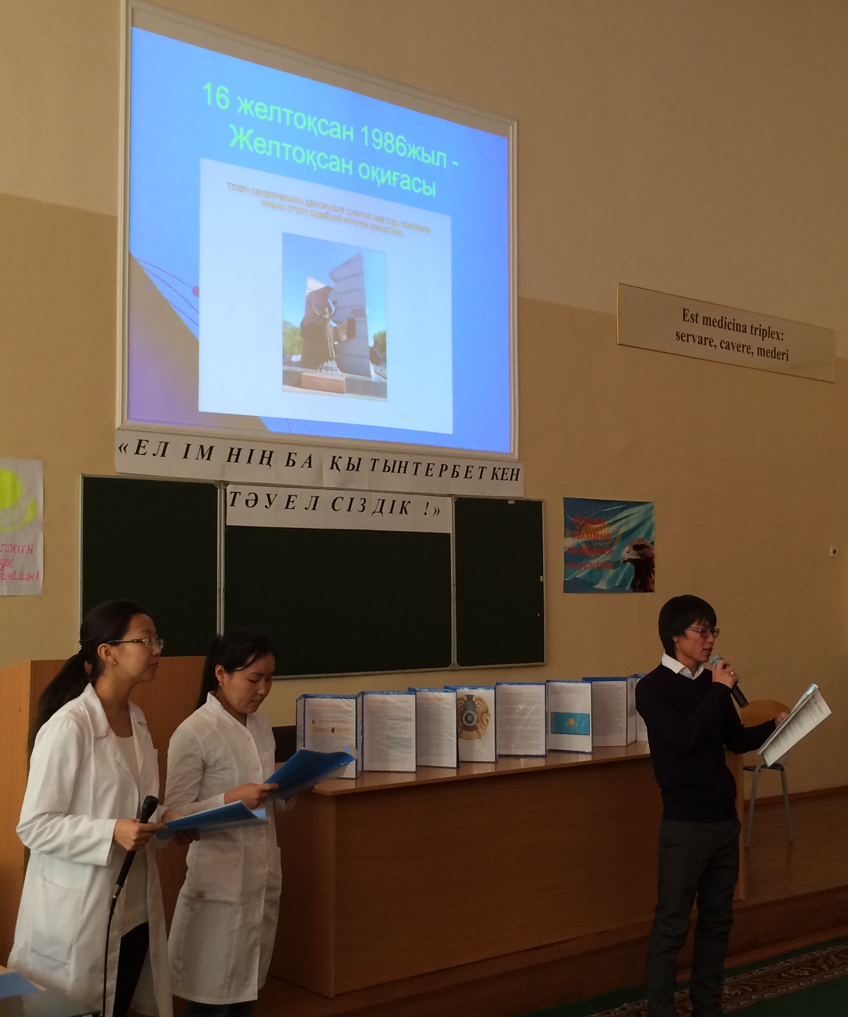 Жалпы медицина факультетінің 1 курс студенттері және информатика модулінің оқытушылары доц. Шадинова К.С., аға оқыт. Алтекова И.С., оқыт. Жакипова Ш.А. ұйымдастыруымен 10 желтоқсан күні №8 аудиторияда сағат 1230-да  «ЕЛІМНІҢ БАҚЫТЫН ТЕРБЕТКЕН ТӘУЕЛСІЗДІК» атты іс-шара өткізілді. Аталған іс-шараға жалпы медицина факультетінің декан орынбасарлары Наккажина С.Х., Бейсегулова Г.Н. қатысты.