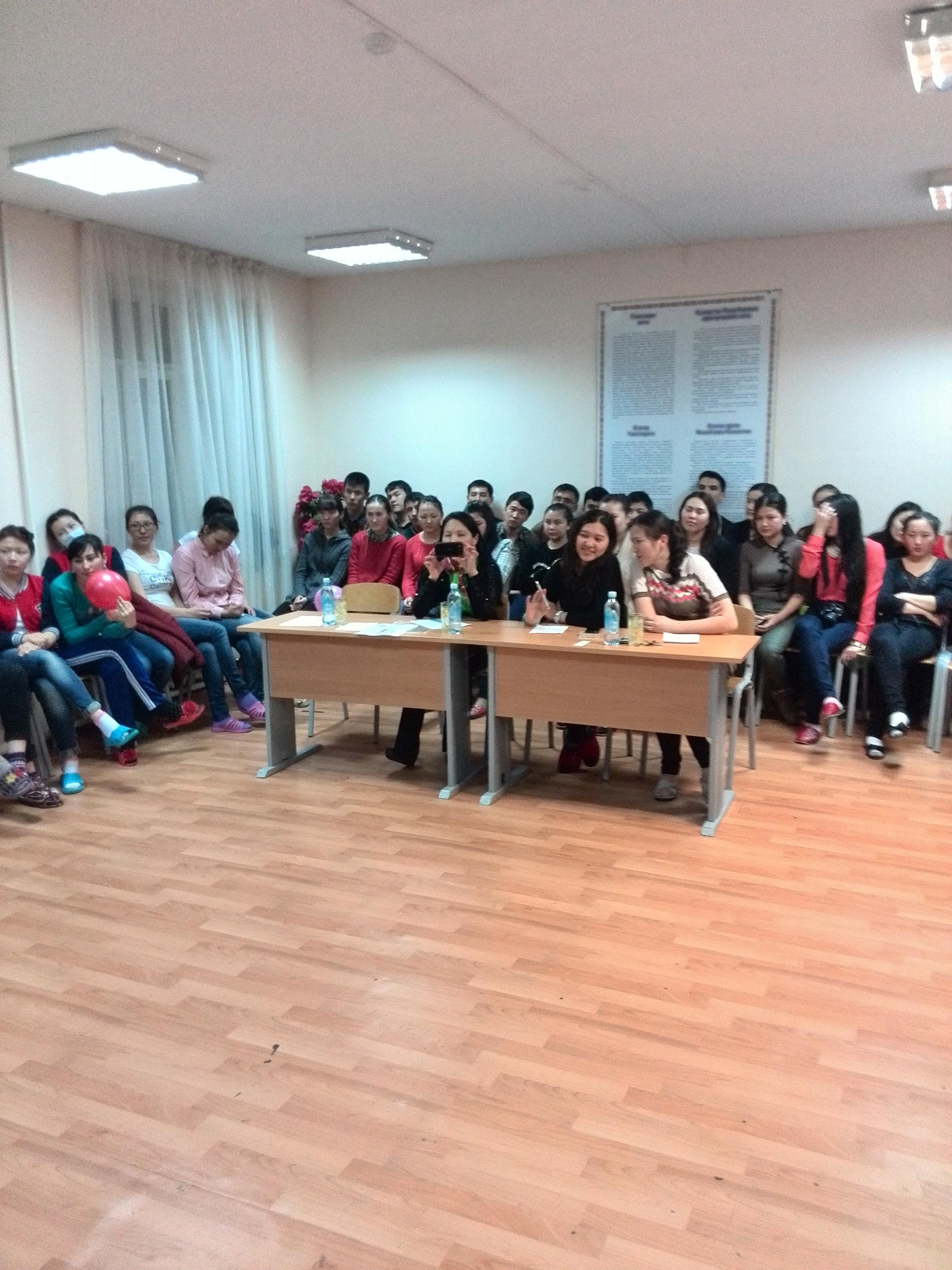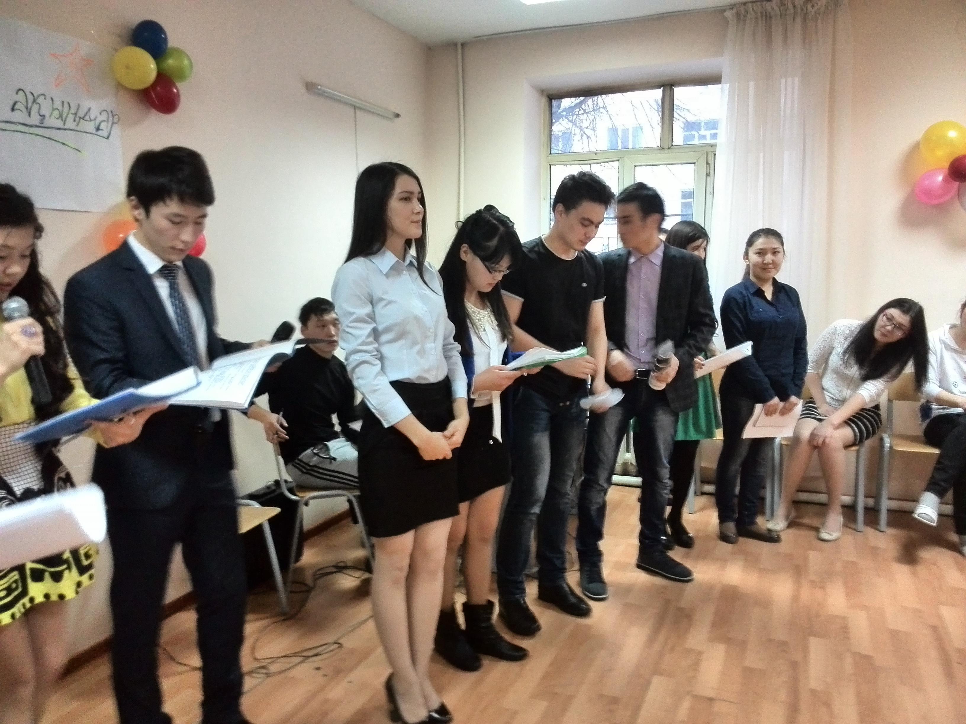 «Ақындар сайысын» ұйымдастыруға ұйытқы болған Студенттер кеңесі. Кеш ұйымдастырушысы: Кішібекова Мөлдір мен Асан Ақерке.
