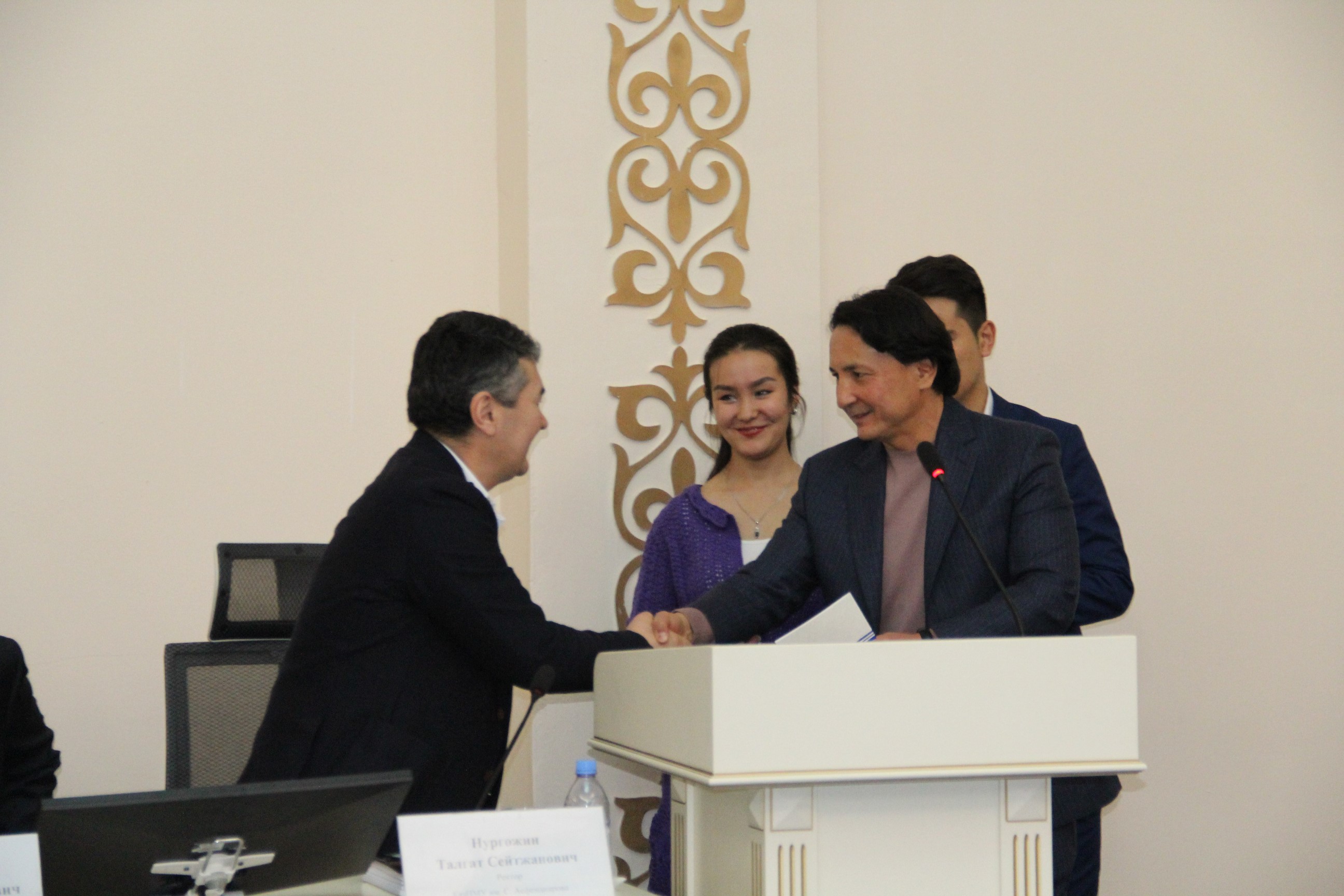 С поздравительным словом выступил ректор КазНМУ им.С.Д.Асфендиярова д.м.н., профессор Нургожин Т.С., а также гости – ректор Казахско-Российского медицинского университета д.м.н., профессор Джайнакбаев Н.Т., директор филиала фонда социального медицинского страхования по г.Алматы, д.м.н. профессор Абильдаев Т.Ш.