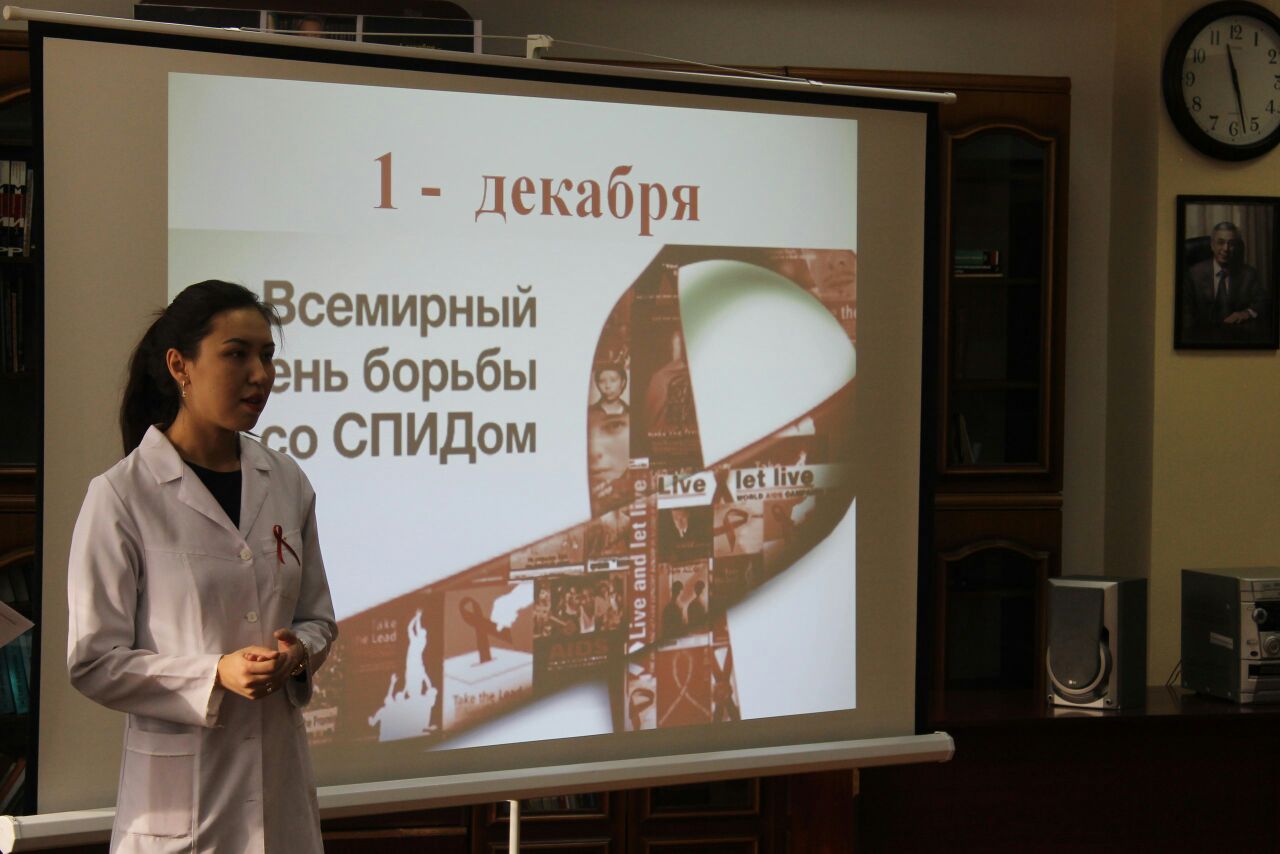Желтоқсан айының сегізінші жұлдызында біздің университетіміздің Жалпы медицина факультетінің 5-курс студенттері,13-009-1 және 13-012-1 топтарының ұйымдастыруымен (топқа жауапты Жүйке аурулары кафедрасының профессоры Туруспекова С.Т.)Алматы Энергетика және Байланыс университетінде «ЖИТС: қорқу қажет емес,білу қажет!» атты тақырыпта шара өткізілді. Ондағы мақсат жастарды ЖИТС-тің қауіптілік деңгейін,одан қалай сақтану және алдын алу керектігі жөнінде кеңінен ақпараттандыру.Бұл шара екі бөлімнен тұрды. Бірінші бөлімде медицина студенттері ВИЧ инфекциясы қазіргі таңдағы өте өзекті мәселердің бірі екендігін,толық анықтама беріп кететін болсақ-адамның иммунтапшылығының нәтижесінде дамитын вирус болып табылады,иммундық жүйені біртіндеп зақымдайды,ол тек адам ағзасында ғана өмір сүреді және ұзақ жылдар бойы.Ағзаның инфекцияға қарсыласу күші төмендеп, адамда өте сирек кездесетін инфекциялық аурулар дамиды.ЖИТС ВИЧ инфекциясы дамуының ең соңғы деңгейі екендігі жөнінде мағлұмат беру,сонымен қатар ЖИТС ауруының пайда болу тарихы туралы,елімізде қашан тіркелгендігі жөнінде,оның таралуы,жұғу жолдары,және алдын алуы,қалай қорғануға болатындығы жөнінде жастарды барынша жоғары деңгейде ақпараттандыруға тырысты. Және аудиториямен тығыз байланыс орнатылды,викториналық сұрақтар қойылды,ЖИТС туралы не білетіндіктері жөнінде сауалнамалар таратылды.Тыңдалымға қатысқан Алматы Энергетика және Байланыс университетінің студенттері қойылған сұрақтарға жауап беруде барынша белсенділік танытты,олар да өз білгендерін ортаға салды,білмеген сұрақтарына да жауап алуға тырысты.Соңына таман медицина студенттері дайындаған брошюралар таратылды,ол арқылы да жастар өздеріне керекті кеңестер ала алады деген мақсатпен.Ал екінші бөлім студенттерді сергіту мақсатында театрлық скечтермен,сюжеттік жағдайлық есептермен және концерттік нөмірлермен толықты.Әрине тақырыптан тыс емес,негізгі тақырыптың аясында,яғни ВИЧ инфекциясының үш жұғу жолын, жүктілік кезінде анадан балаға,сақтанбаған жыныстық қатынас және емдеу мекемелерінде залалсыздандырылмаған шприц арқылы жұқтырылған үш тағдыр көріністе баяндалды. Домбыра шертілді,ән шырқалды.Бұл қойылған шарада медицина студенттері қазіргі заманның өзекті мәселесін жан-жақты көрсете білді , және жастардың санасына кішкене болсада сіңірілді деген ойдамыз.