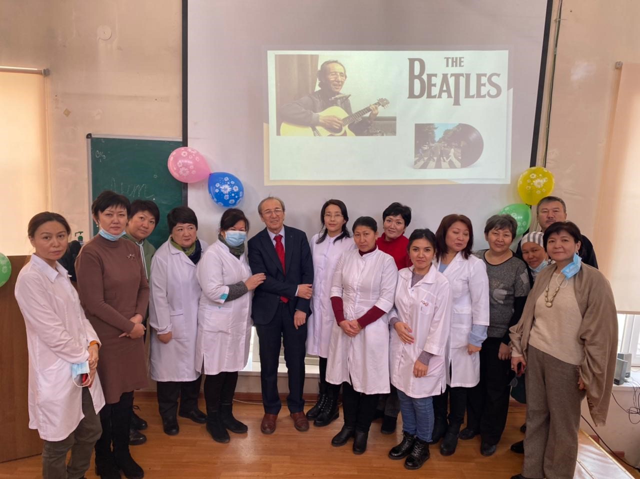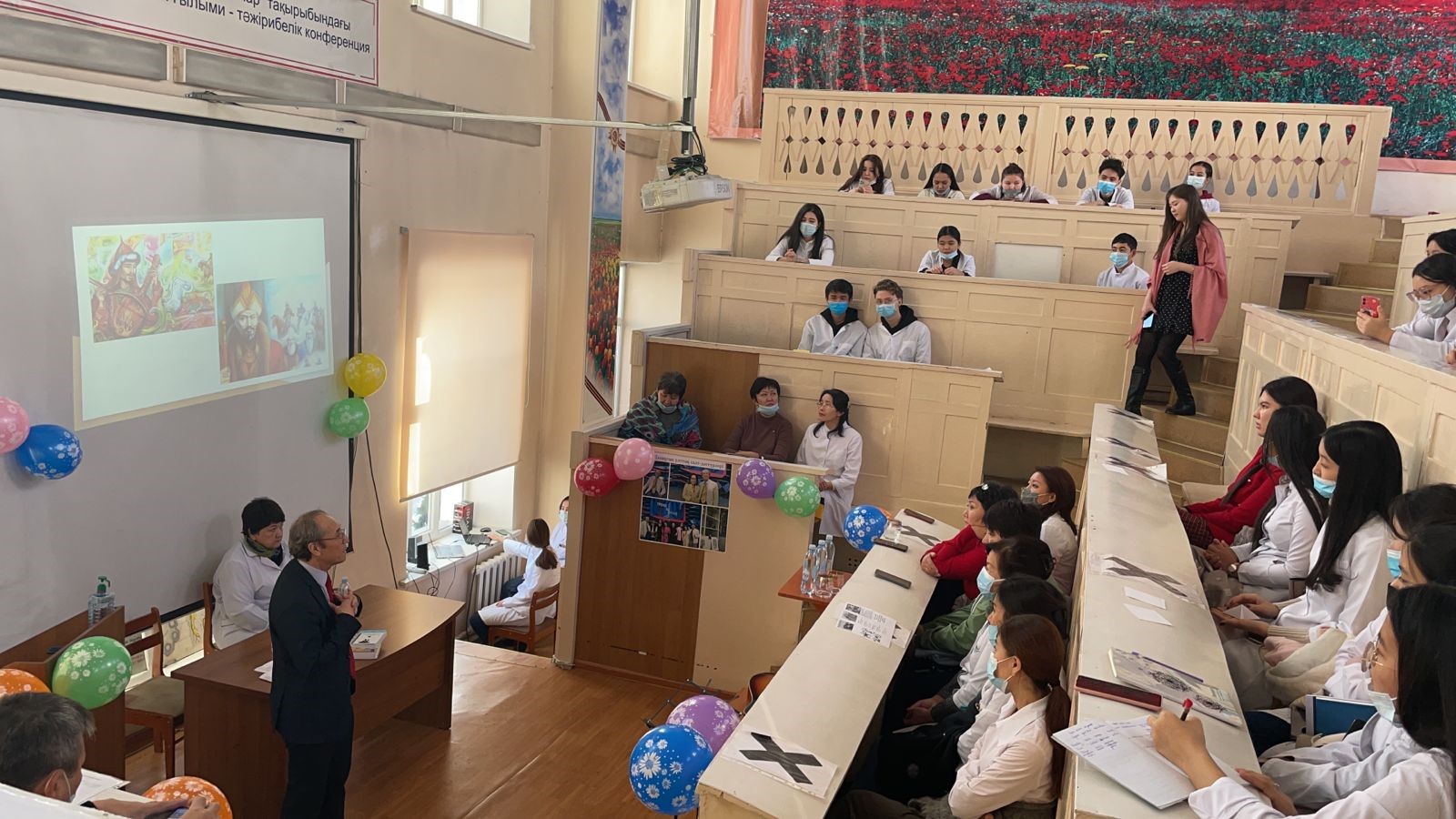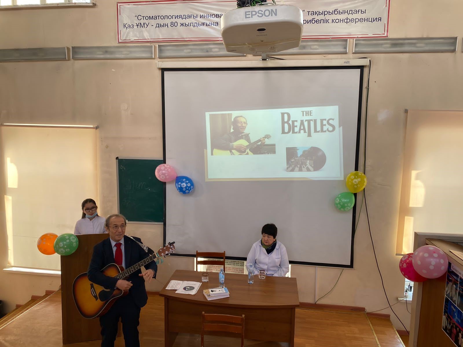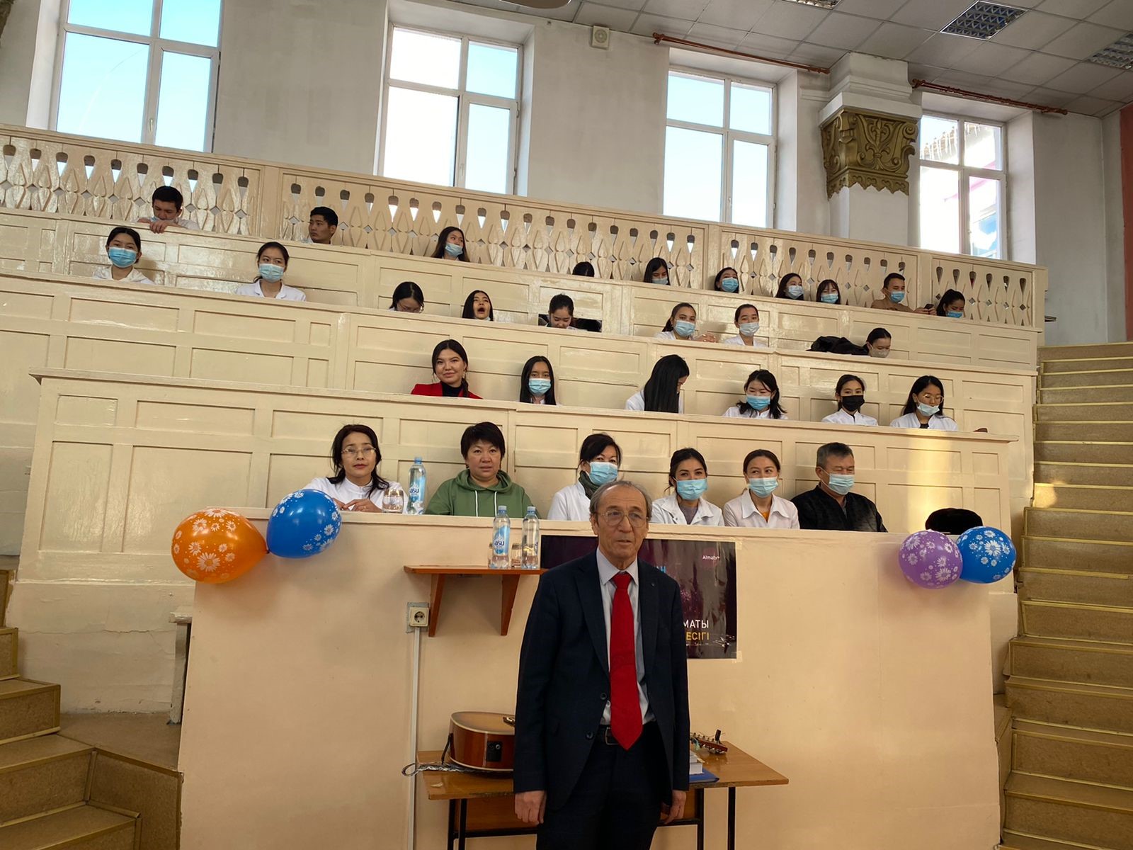 On November 20, 2021, Auditorium # 1 at 10.00 o’clock held a round table dedicated to the 30th anniversary of the Independence of the Republic of Kazakhstan on the topic “Belgili madeniettanushi Berdaly Ospanny dara Zholy”, organized by Professor Dyusembaeva A.T., lecturers Baigamysova D.S. and Abiyrova N.B. The event was opened with introductory words by Professor Dyusembaeva Asya Tulebaevna. The teaching staff of the department took part in the round table (Akhmad N.S., Baigamysova D.S., Iskindirova A.M., Iskakova L.A., Tukibaev Zh.A., Abiyrova N.B., Balapanova A.A., Musina M.S., Syzdykov D.M., Alzhanbekova G.T., Okhanova M.I., Abilova A.A. Tolkyn Kadyrzhanovna) and students of the department of curatorial groups of the 2nd year of the Faculty of General Medicine and the 2nd year of the Faculty of Pediatrics. At the beginning, Berdali Yesimkhanuly told about himself, his family, about his books, about creativity, about participation in the World Festival of the Beatles in England, which took place in the city of Liverpool, in 1994. Photos were shown, about his own drawings and between stories were performed Beatles songs on guitar in English and own translation of Beatles songs in Kazakh. The event was held at a high level, questions were asked by students and teachers of the department, and also songs and dances were performed by students for our guest.