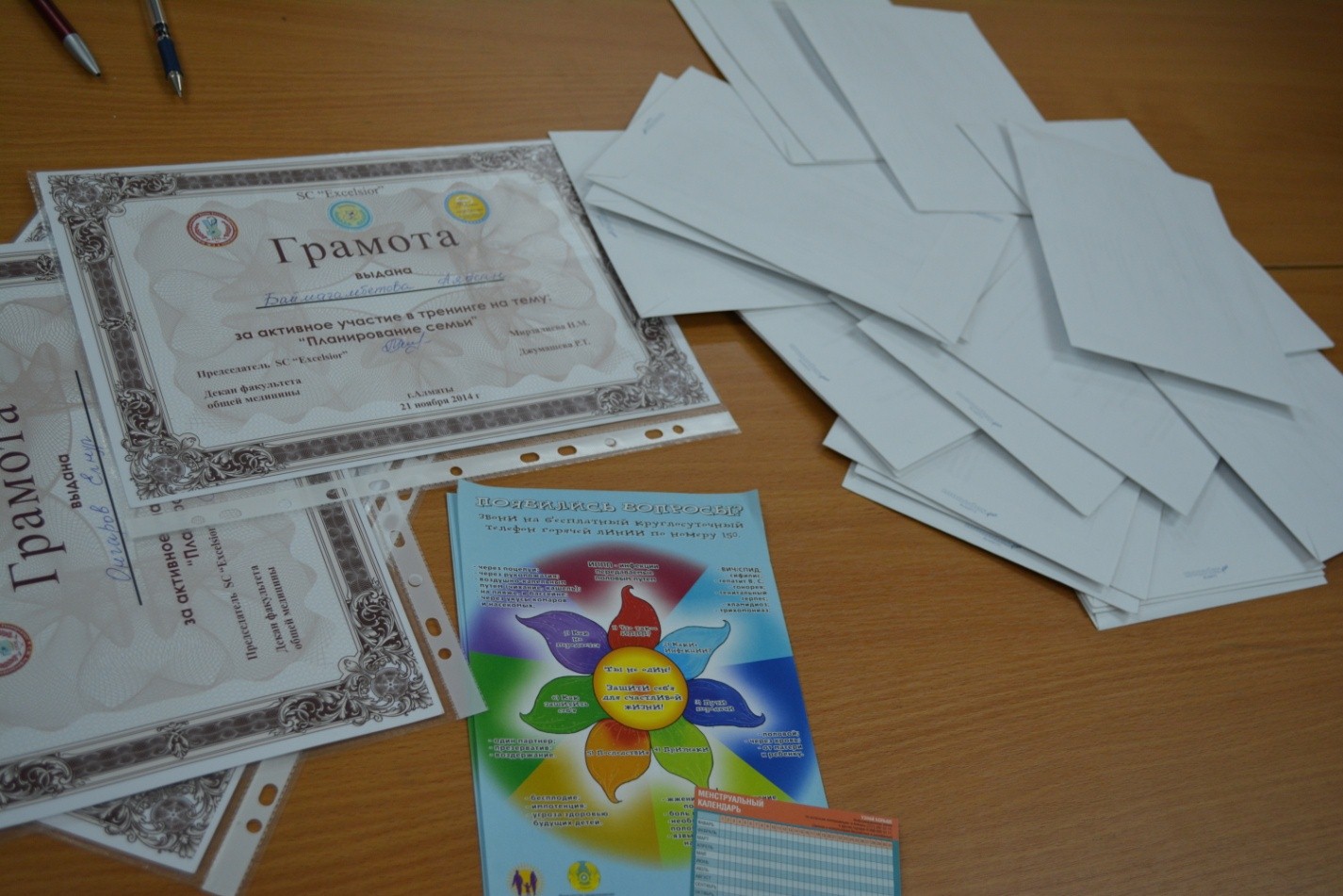 2014 жылдың 21 қарашасында жалпы медицина факультетініңScience club “Excelsior” тобымен бірінші курс студенттері үшін №2 жатақханада «Отбасын жоспарлау» тақырыбында семинар-тренинг өткізілді.Семинар-тренингте әйел адам мен ер адамның репродуктивті жүйесінің ерекшеліктері, жастардың репродуктивті мінез-құлқы, қазіргі заманғы контрацепция түрлері, отбасын жоспарлаудың өзекті мәселелері сияқты сұрақтар талқыланды.Семинар- тренинг барысында видеороликтер көрсетіліп, студенттерге ақпаратпен қамтылған ескертпе қағаздары таратылды. Сонымен қатар түрлі клиникалық жағдайлық есептер шешу барысында, студенттер арасында пiкiрталас туғызды. Аталған шара натижесінде, студенттер келешекте отбасын құру және оны жоспарлауда түрлі ақпараттар алды деген ойдамыз. Белсендіқатысқанстуденттергемарапаттауқағазыұсынылды.