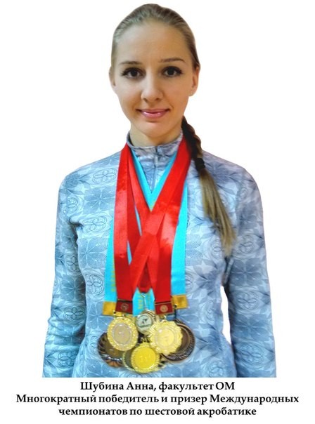 Шубина Анна гордость нашего факультета, она многократный призер соревновании –Золотой призер Открытого чемпионата Кыргызстана «Miss & Mr. Pole Dance KG 2012» в категории «дуэты»; Серебряный призер Международного чемпионата по шестовой акробатике 2013, категория «Pole Acrobatic»; Золотой призер Международного чемпионата по шестовой акробатике 2013, категория «дуэты»; Бронзовый призер Открытого чемпионата Азии Pole Sport 2014, категория «дуэты»; Золотой призер Международного чемпионата по шестовой акробатике «Miss & Mr. Pole dance KZ 2014» в категории «дуэты»; Бронзовый призер 2го открытого чемпионата РК «Pole dance star of Eurasia 2014» в категории «Pole dance Show»; Серебрянный призер 2го открытого чемпионата РК «Pole dance star of Eurasia 2014» в категории «дуэты».