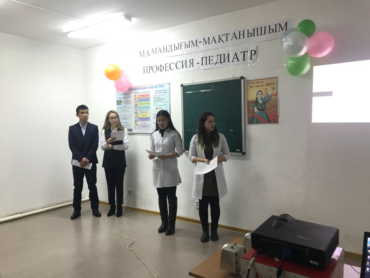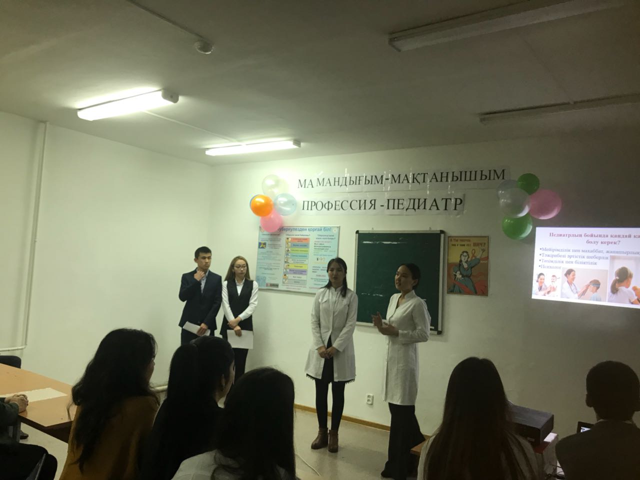 Воспитательный вечер проведен в рамках международного дня Педиатров и в программе были озвучены темы «Білікті педиатр – дені сау ұрпақтың кепілі» (студенты ЖМ-14-25-2 группы: Қарасаева Асель, Кунградова Азиза), «Ведущие педиатры РК» (студенты ЖМ-14-21-1 группы: Өскенбек Салтанат, Абдураим Актоты), «Этика и деонтология» (студенты ЖМ-13-32 группы: Сейдахан Жазира, Турсынкул Багдаулет) и фоновым патологиям детского возраста: «Рахит» (студенты ЖМ-13-32 группы Кенова Сагыныш, Молайханов, Шохмурад), «ЖДА» (студенты ЖМ-13-32 группы Тануарбек Улжан, Рахымжан Балауса), «Диатездер» (студенты ЖМ-13-32 группы Абдимомын Жулдыз, Ерланкызы Айдана). Для закрепления знаний фоновых заболеваний у детей студентами ЖМ-13-32 группы Абдикуловой Лаурой, Тажимбетовой Гульзадой, Амануллаевой Маржан, Куралбек Гаухар, Ускенбай Мадияр проведена викторина со включением  обратной связи.
