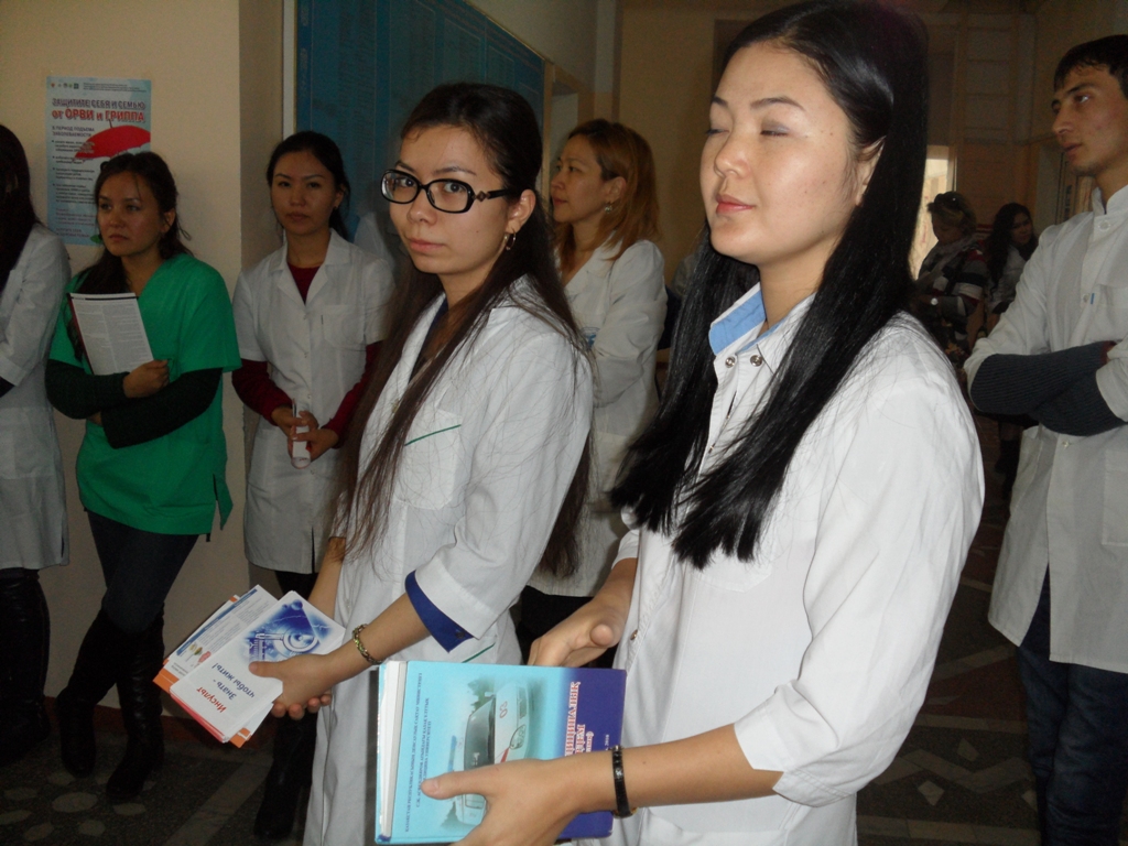 В проведении флеш-моба активное участие принимали все студенты, но особо отличились студенты 5 курса ОМ 34-1 (Артыкбаева Асем, Дауталиева Акбала, Жапар Құрбан) и 34-2 группы (Мұхтарова Гүлнұр), что представлено на рисунках 3-6. Студенты измеряли артериальное давление пациентам с артериальной гипертензией, читали лекции, беседовали с пациентами, а также раздавали больным брошюры по профилактике инсульта.