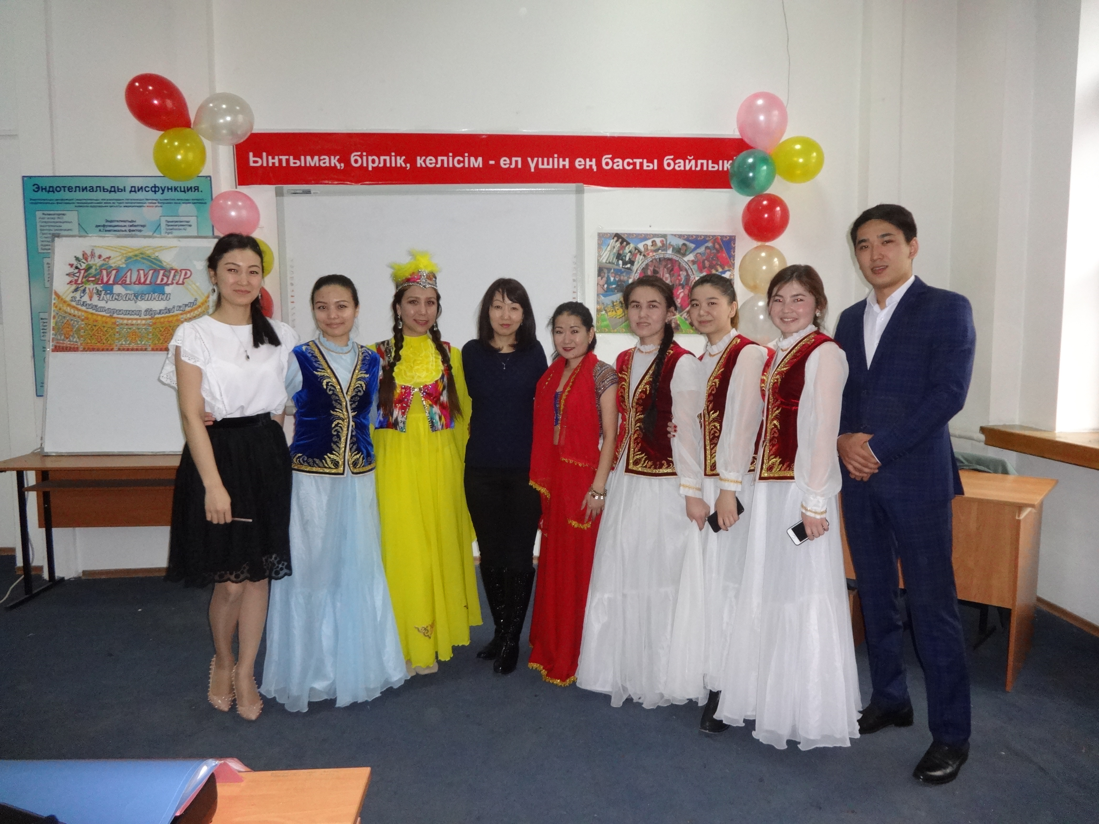 Студентами 14-019-02 группы III курса факультета «Общая медицина» под руководством ППС кафедры нормальной физиологии с курсом валеологии совместно с ППС кафедры фармакологии было организовано и проведено мероприятие, посвященное празднику 1 мая «Ынтымақ, бірлік, келісім – ел үшін ең басты байлық» (04 апреля 2017 г.) в аудитории №18 с приглашением проректора по воспитательной работе Р.Т.Джумашевой, начальника управления по воспитательной и социальной работе М.Т.Султановой, декана факультета «Общая медицина» Г.А.Шопаевой, заместителя декана 4 курса Ж.Ж.Курмангалиевой, заместителей декана 3 курса С.Х.Наккажиной и Г.Н.Бейсегуловой. Ответственные за мероприятие и студенты 14-019-02 группы III курса факультета «Общая медицина» обратили внимание студентов на формирование дружеских отношений между студентами; воспитывать у студентов уважение к культурам, историческому прошлому и наследию народов, проживающих в Казахстане; формирование у студентов казахстанского патриотизма посредством культурного наследия народов Казахстана, что и явилось целью проведенного вечера.