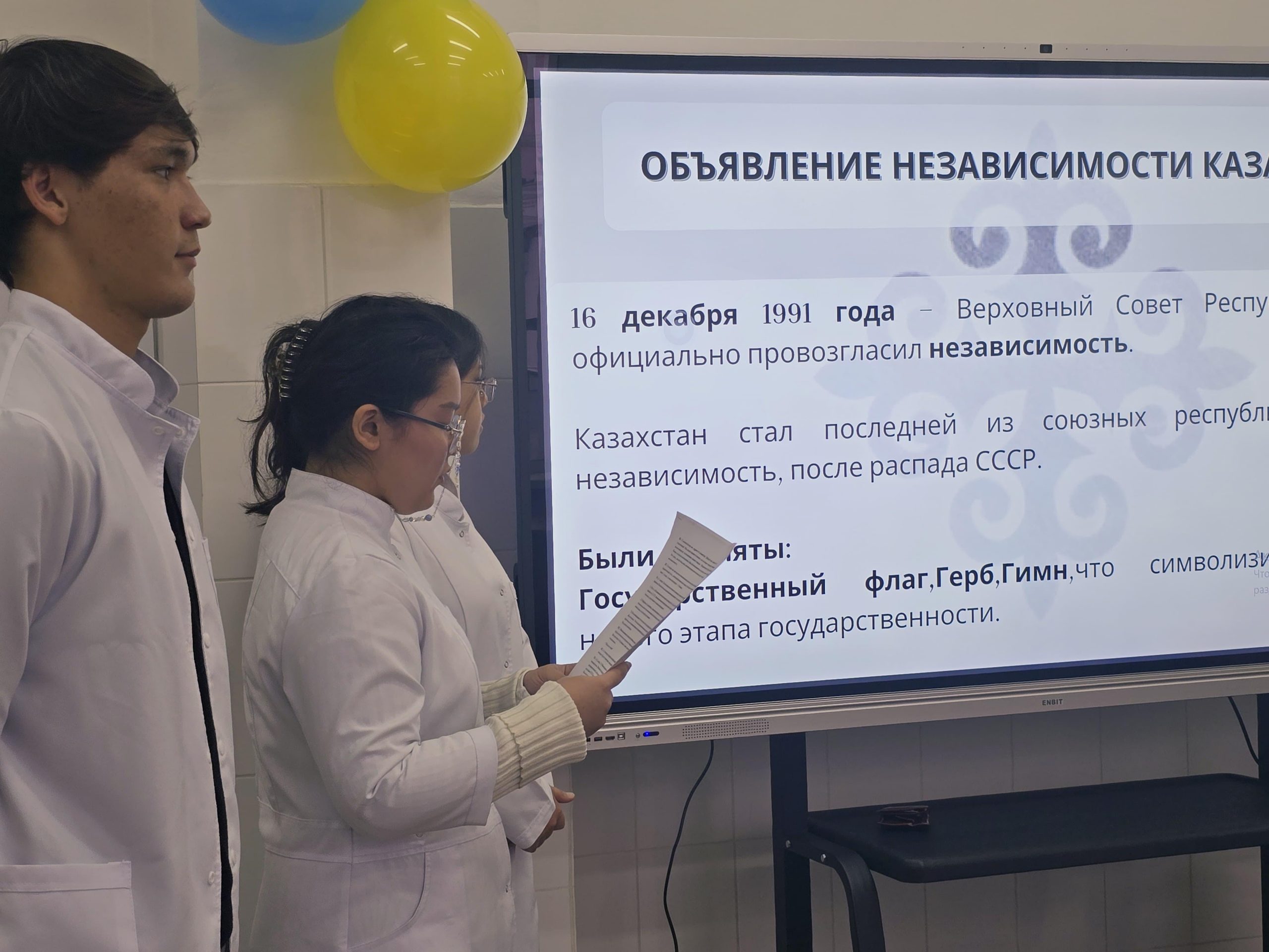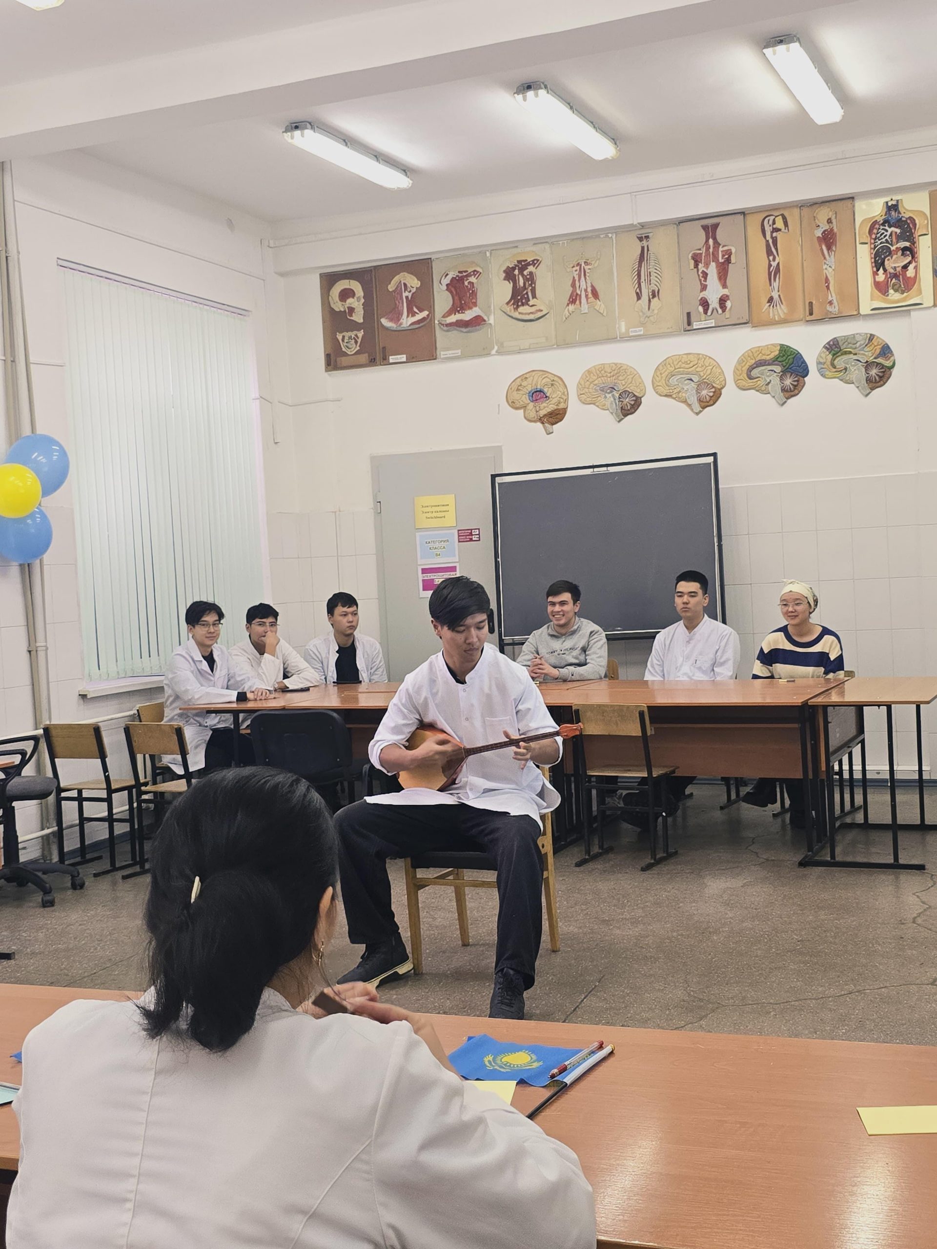 The event’s hosts, Saidulla Togzhan and Kairatov Alan (GM 25-047), first introduced those present to the historical events that led to independence. Following the historical information, the kyui “Konil tolkyny” was performed by Symbat Kulbaeva, a student from the Faculty of GM 25-005.