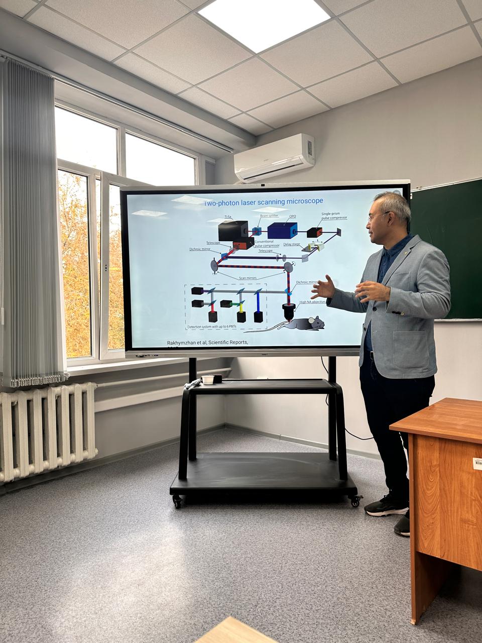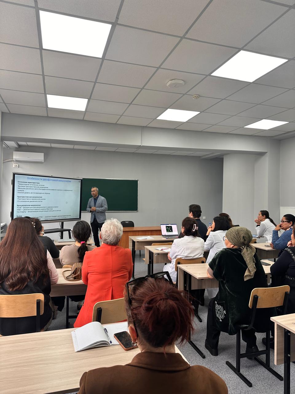 The first meeting took place on October 27, 2025, in Room 409, Auditorium 7. The session was organized by Assistant Professor, PhD Rakhymzhan Asylkhan Anuarbekuly, who delivered a scientific presentation on current trends in modern biomedical research. During the meeting, international scientific publications focusing on the application of two- and three-photon microscopy techniques were discussed.