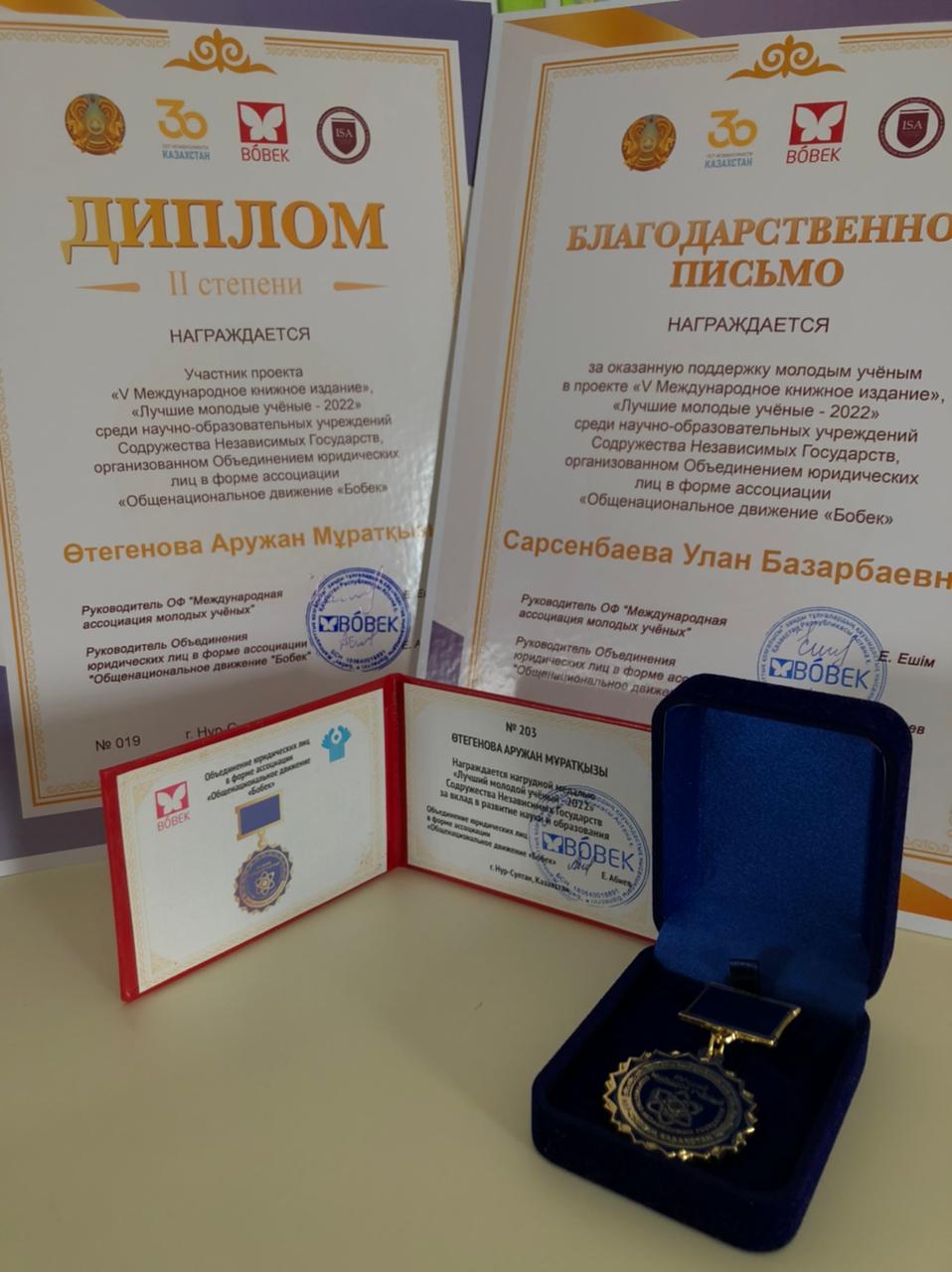 Жалпы медицина-1 мектебінің 2-курс студенті Өтегенова Аружан 4-маусымда Нұр-Сұлтан қаласында, білім және ғылым министрлігінде марапаттауда болып қайтты. Қазақстан және Өзбекстан білім және ғылым министрлерінен “Лучшие молодые учёные-2022» атағын және медаль иеленіп қайтты.