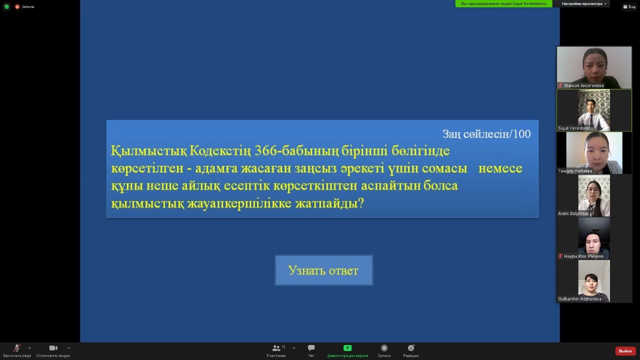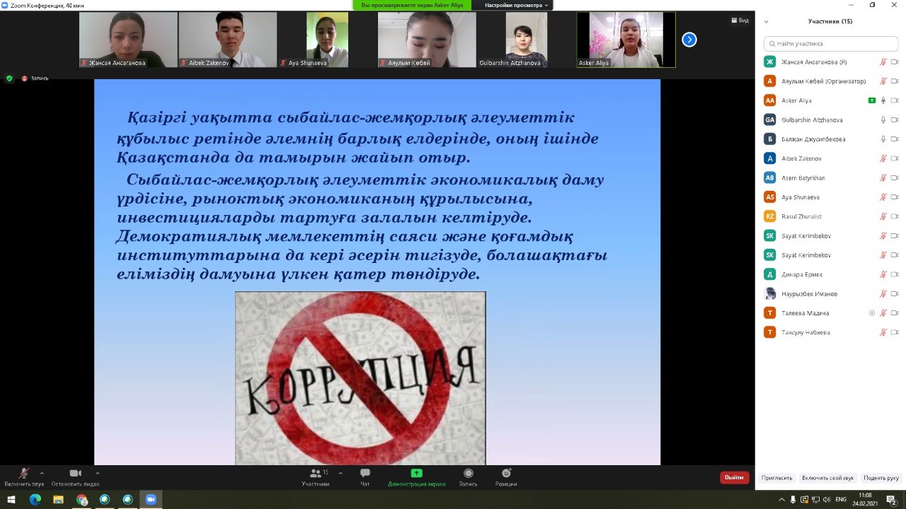 «Сыбайлас-жемқорлықпен күрес» тақырыбында қалыпты физиология кафедрасы және Жалпы медицина-1 мектебінің В086-«Жалпы медицина» мамандығы бойынша, 2 курс ЖМ19-011-2к тобымен бірігіп, онлайн «ZOOM» платформасында іс-шара өткізілді.
