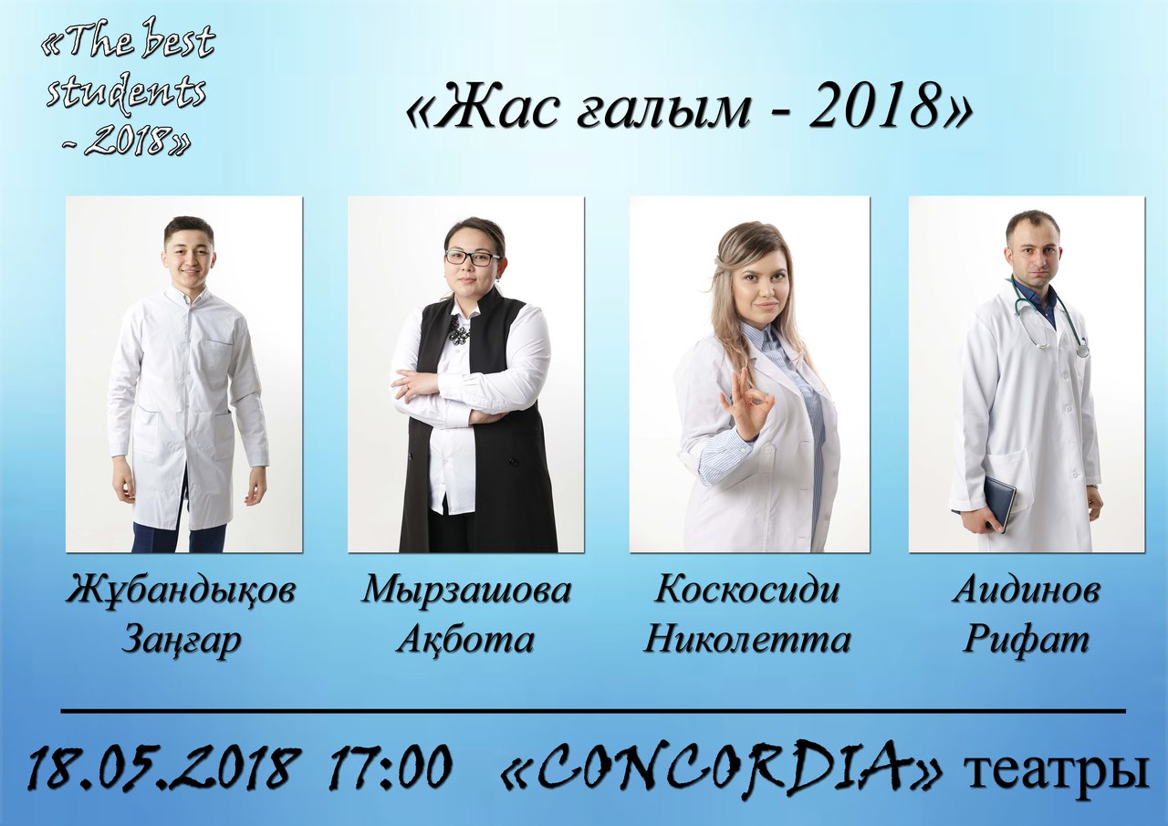 Сіздерді Жалпы медицина мектебі студенттік Деканаты ҚазҰМУ Білім алушылар кәсіподағы қолдауымен өтетін дәстүрлі , үздіктерді анықтайтын «The best students -2018» байқауының финалдық кезеңі дауыс беруге шақырамыз. Дауыс беру 15 мамыр күні сағат 10:00 – 20:00 арасында II интрода өтеді. Дауыс беруге Жалпы медицина мектебі студенттері студенттік билетпен дауыс бере алады. Комиссия шешімі және студенттер дауысы қоса ең көп дауыс жинаған студенттер 18 мамыр күні 17:00-де «Concordia» театрында «The best students -2018» байқауы қорытынды кешінде анықталып, марапатталады.
