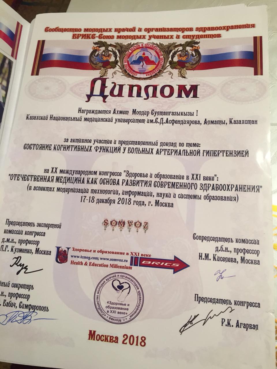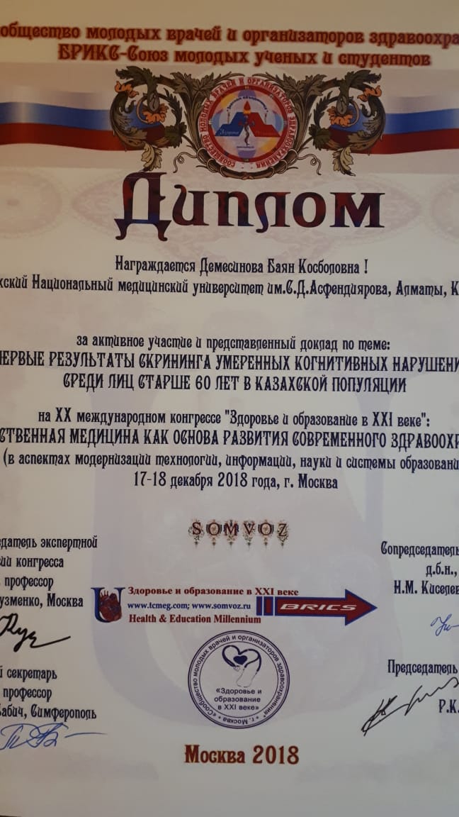 в мероприятии под руководством заведующей кафедры нервные болезни с курсом нейрохирургии Туруспековой С.Т., приняли активное участие ассистент кафедры Демесинова Б.К и студенты 5 курса факультета общей медицины Ахмет М.С. и Жомартова А.Б. Ассистент Демесинова Б.К выступила с научным докладом на тему: «Первые результаты скрининга умеренных когнитивных нарушений среди лиц страше 60 лет в казахской популяции», а темой доклада наших студентов была: «Состояние когнитивных функций у больных артериальной гипертензией».