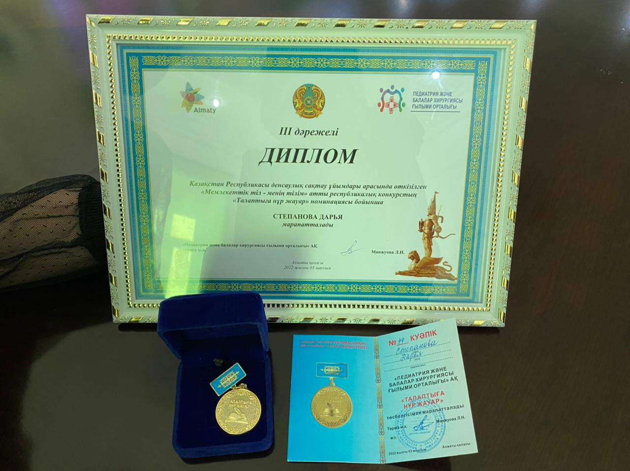 2022 жылдың 12 қыркүйек айында Жалпы медицина-1 мектебінің 2 курс студенті Қазақстан Республикасы денсаулық сақтау ұйымдары арасында өткізілген «Мемлекеттік тіл — менің тілім» атты республикалық конкуста Степанова Дарья «Талаптыға нұр жауар» номинациясымен марапатталды. Біздің мақсатымыз өзгенің байлығы, сұлулығы және икемдігі жағынан дүние жүзіндегі озық тілдермен теңдесе алатын ана тіліміз бар екенін ұмытпау болып табылады.