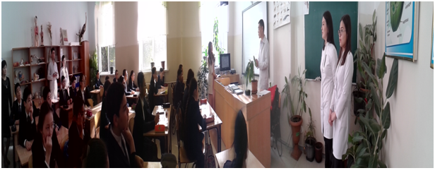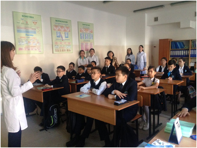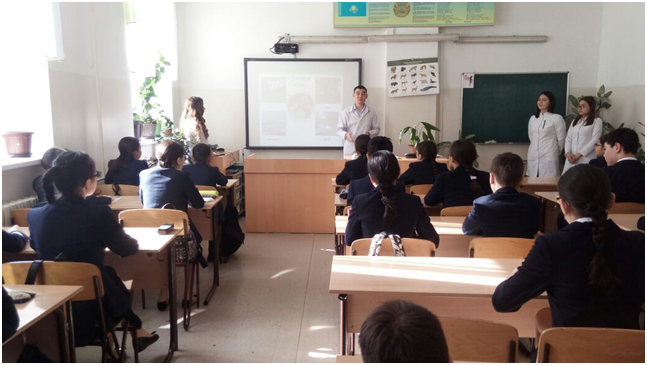 25 апреля 2017 года студентами 5 курса «Обшей медицины» была проведена воспитательная работа с учениками в специализированном лицее № 39-имени С.А. Ходжикова по заявке директора Жумалиева М.С. С докладом выступили студенты факультета «Общей медицины» 17-1 группы Қуатбек Малика и Нахаева Ұлданай в 9 «А» классе на тему: «Социально-психологические последствия употребления наркотиков и психоактивных веществ». Доклад на тему: «Здоровый образ жизни» подготовила студент факультета «Общей медицины» 20-1 группы Әбуғалиева Назерке для учеников 6 «А» класса. Тұрлықожаев Абзал студент 22-2 группы выступил с докладом о профилактике заболеваний опорно-двигательной системы под названием: «Движение – это жизнь». Студент 21-1 группы Абилкаир Ерлан прочитал доклад на тему «Закономерности развития детского и подросткового организма, гигиена подростков для учеников 7 и 8 классов.