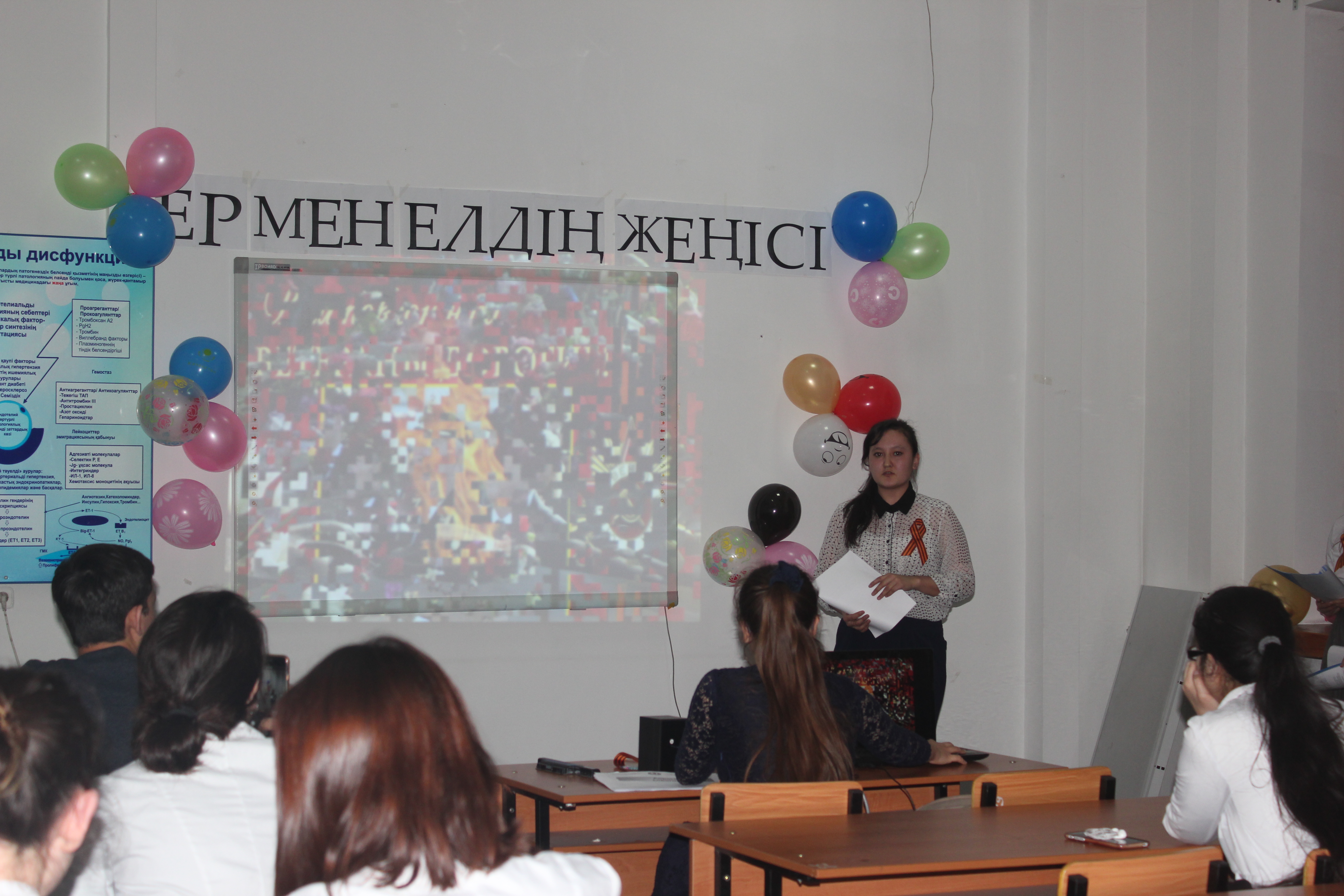 Студентами 14-024-02 группы III курса факультета «Общая медицина» под руководством ППС кафедры нормальной физиологии с курсом валеологии совместно с ППС кафедры нормальной анатомии был организован и проведен вечер, посвященный Дню Победы в Великой Отечественной Войне 1941-1945 гг. «Ер мен елдің жеңісі!» (05 апреля 2017 г.) в аудитории №18 с приглашением проректора по воспитательной работе Р.Т.Джумашевой, начальника управления по воспитательной и социальной работе М.Т.Султановой, декана факультета «Общая медицина» Г.А.Шопаевой, заместителя декана 4 курса Ж.Ж.Курмангалиевой, заместителей декана 3 курса С.Х.Наккажиной и Г.Н.Бейсегуловой, начальника военной кафедры, полковника медицинской службы, кандидата медицинских наук Ж.Т.Исабаева. Ответственные за мероприятие и студенты 14-024-02 группы III курса факультета «Общая медицина» расширили  знания студентов о Великой Отечественной войне; развитие и воспитание патриотических чувств на ярких примерах героизма и жизни своих сверстников в годы войны; воспитывать у студентов чувства патриотизма и уважения к памяти защитников Отечества; развивать лучшие качества человека: патриотизм, гражданственность, гордость за свою Родину, стремление к миру, что и явилось целью проведенного вечера.