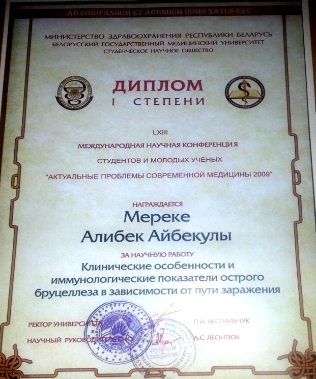 Жұқпалы аурулар кафедрасының 1 оқу жылының резиденттері Садуова Н.Е., Абубакирова А.Т., Усманова А.М. ҚазҰМУ-ң «Ғылым Күніне» арналған СҒЗЖ және СМУ өткізілген конкурстың 2 турына «Энтеровирусты этиологилы серозды менингит» баяндамамен қысып «Ұздік баяндама» сертификатымен марапатталды (ғылыми жетекші проф.Егембердиева Р.А.).