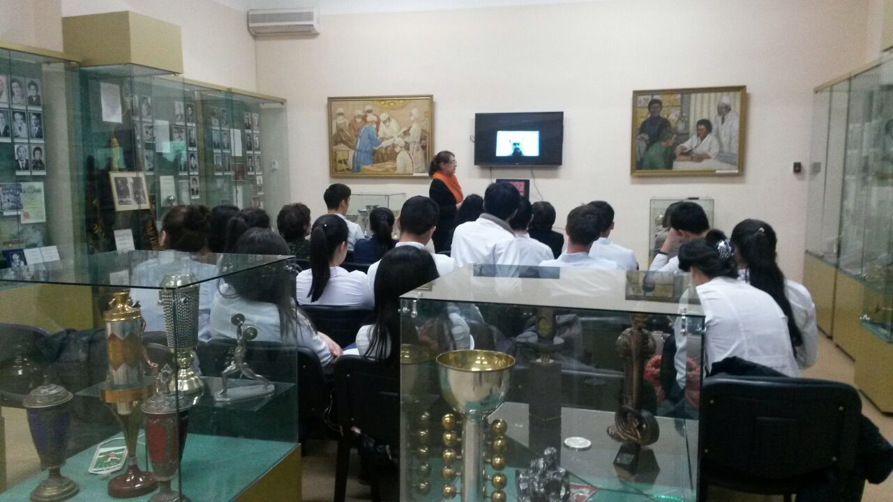 Г.А. Алдибекова, 42-1 тобының студенті Оңалбек Нұржан Ұлы Отан соғысының ардагерлері: Р. Қошқарбаев, Х. Досжанова туралы жалпы медицина және стоматология студенттерімен әңгімі өткізді. Студенттерге соғыстан видео көріністер және кинодан үзінді көрсетілді, би және ән айтылды. ҰОС батырларына арналған фотокөрме ұйымдастырылды.