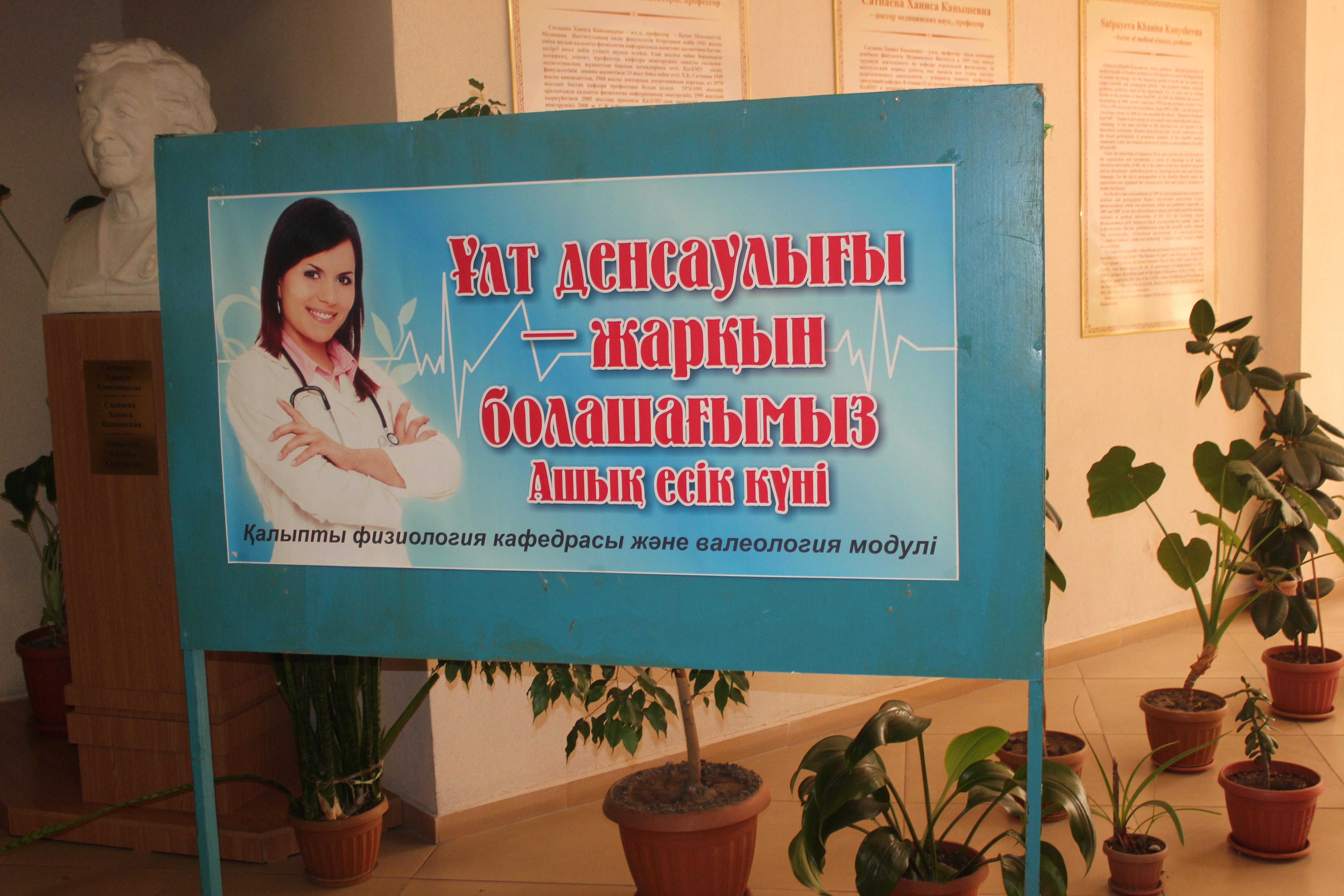 07.04.2014г. во «Всемирный день здоровья» кафедра нормальной физиологии и модуль валеологии провели день открытых дверей под лозунгом «Здоровье нации – это основа нашего успешного будущего». Всем желающим было предложено определить функциональные состояние организма и биологический возраст. В акции приняли участие более четырехсот человек, в том числе студенты, сотрудники университета, представители деканата факультета «Общая медицина», управление по социально – воспитательной работе.