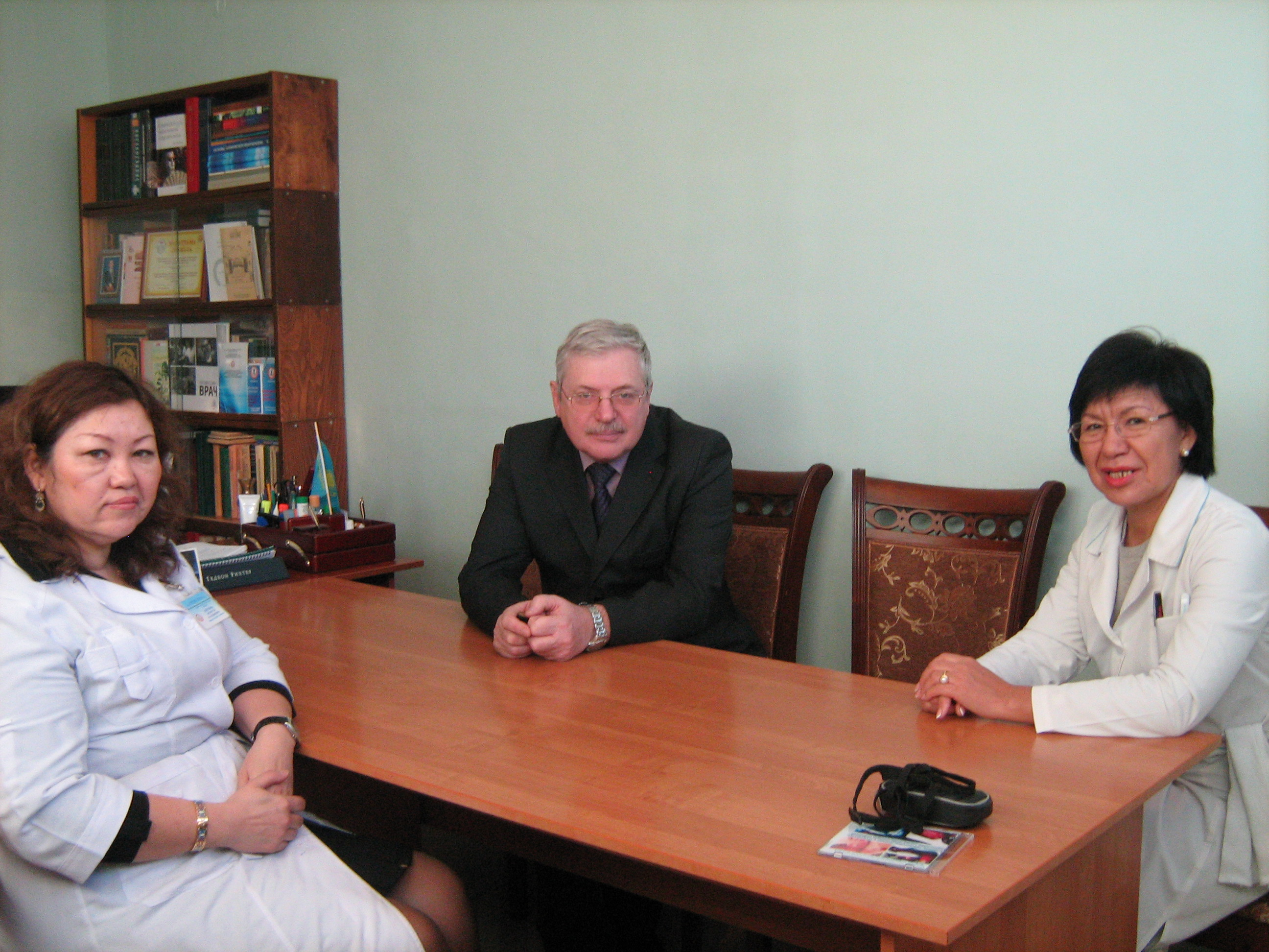 Проф. Рудаков Н.В. ҚазҰМУ жұқпалы және тропикалық арулар кафедрасының меңгерушісі проф. Дүйсенова А.К. және ҚазҮБСУ жұқпалы аурулар кафедрасының меңгерушісі проф. Доскожаева С.Т. кездесуі (желтоқсан, 2013ж.)114