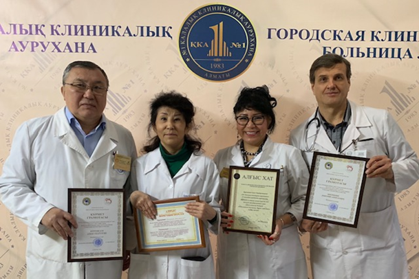 Біздің кафедрамыздың қызметкерлері тәжірибелік денсаулық сақтау саласында кеңестік-диагностикалық көмек көрсету саласында көп жылғы белсенді ынтымақтастық жұмыстары үшін еңбектері еленіп, марапатталды. Туруспекова С. Т. және доцент Избасарова А. Ш. “Алғыс хаттармен”, профессор Нургужаев Е. С. және доцент Митрохин Д. А. Алматы қаласы Денсаулық сақтау басқармасының грамоталары табысталды.