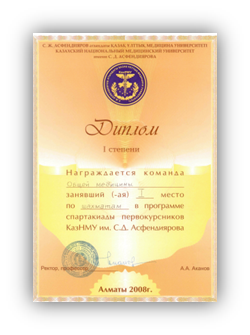 Студенты факультета общей медицины имеют многочисленные грамоты, сертификаты, благодарственные письма за активное участие в различных мероприятиях на уровне университета, города, республики. Команда ССО получили первое место среди вузов г.Алматы.