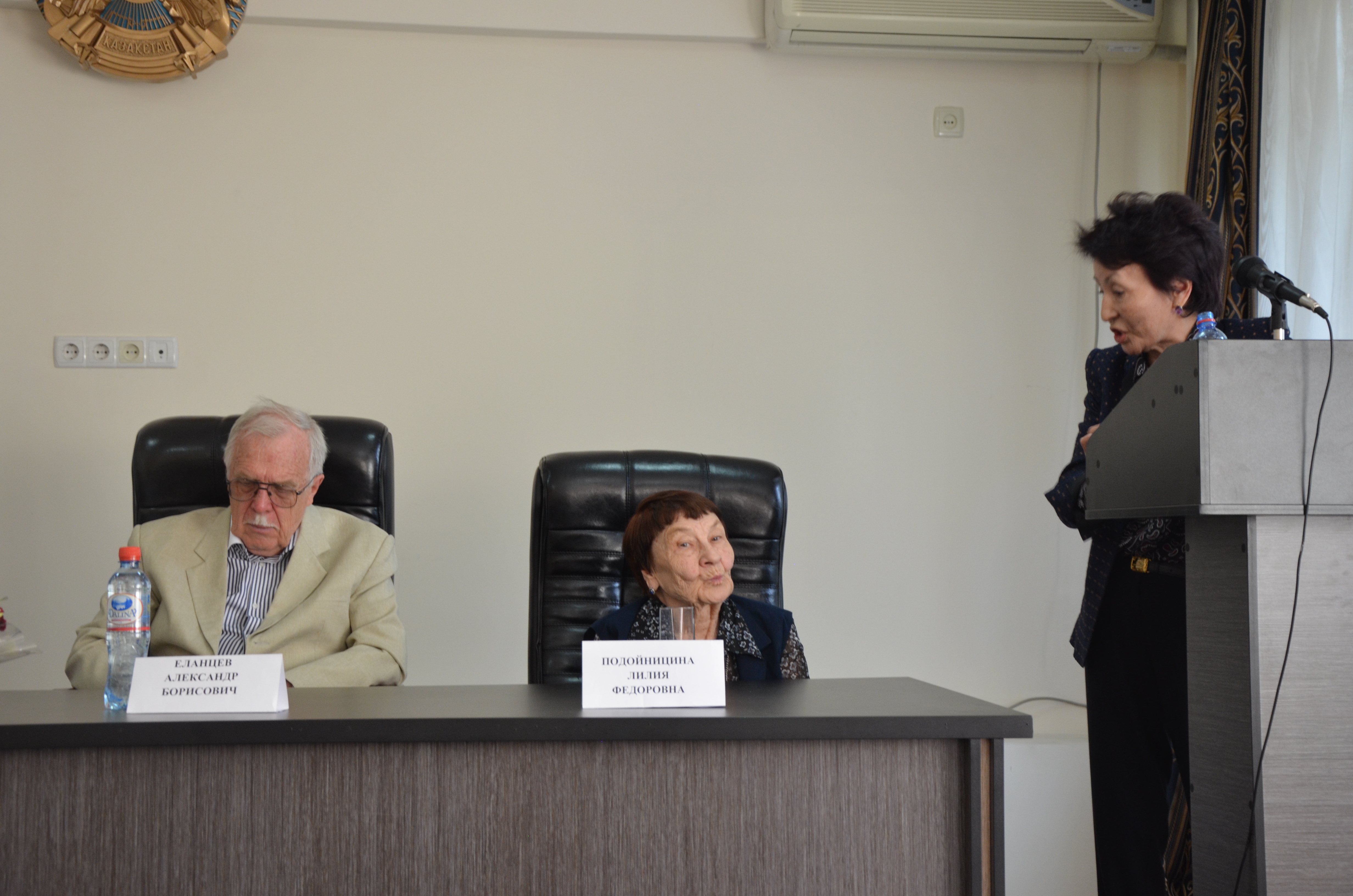 Сонан соң қадырлі қонақ, м.ғ.к., ассистент Подойницина Л.Ф. алып келген естелік суреттерді көрсетіп, студенттік өмірі жайында және профессор Б.В.Еланцевтің оқыған дәрістеріне тоқталып кетті.
