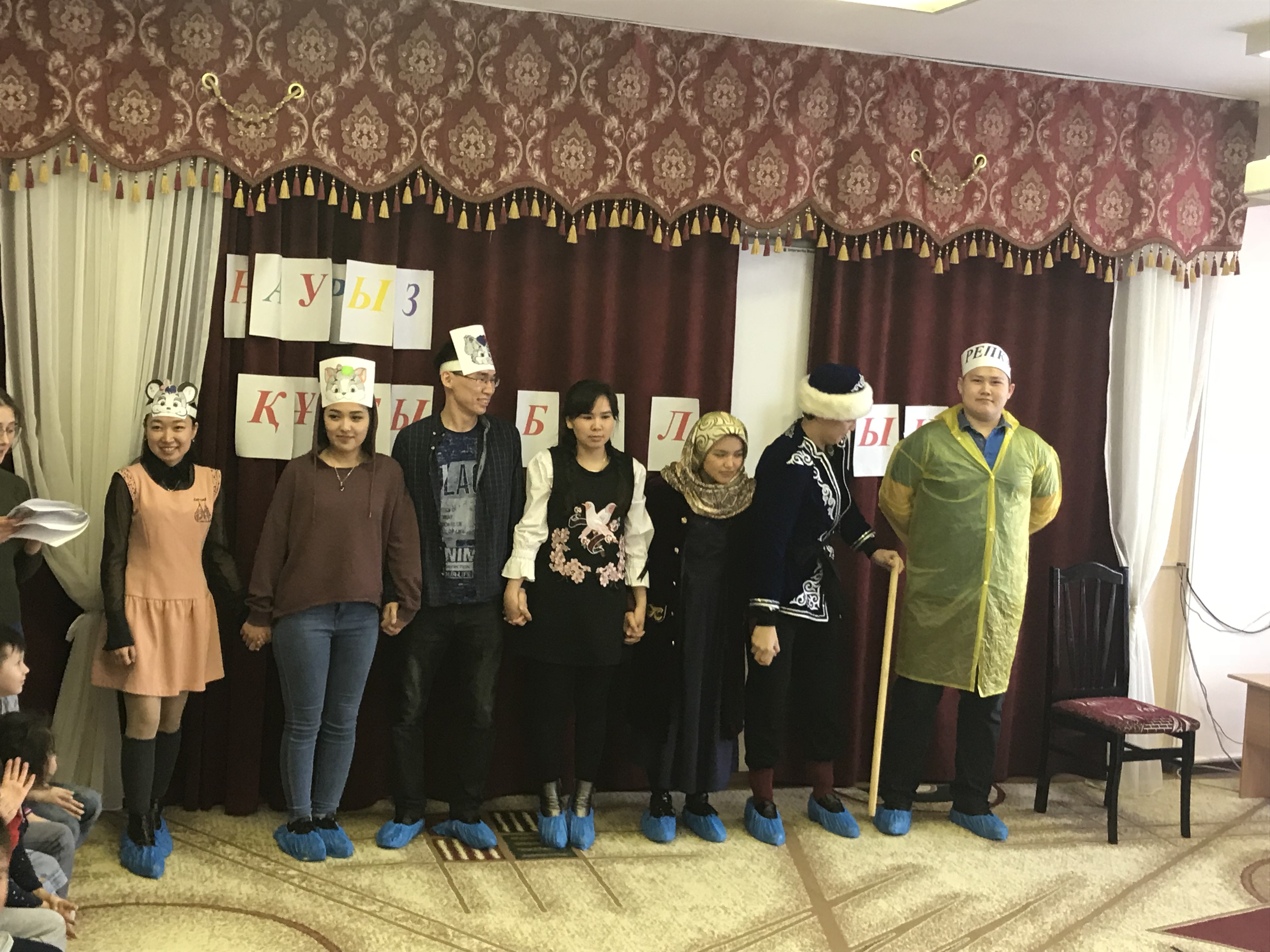 ЖМ мектебінің 3 курс тьюторлық  топ студенттері балаларға арналған ертегі қойылымын дайындап, шеберлікпен ойнап шықты. Қыздарымыз іс-шара көктемге, Наурыз мейрамы қарсаңына сәйкес болғандықтан мерекелік ән шырқап, күй ойнап, би биледі. Жас бүлдіршіндер әсіресе ертегіге таңданып, тамашалаумен болы. Мерекенің соңында балабақшаға әдістемелік жұмыстарына қажетті ұлттық киім киген қуыршақтар сыйға тартылды. Балаларға тәттілер мен жеміс-жидектер таратылды.