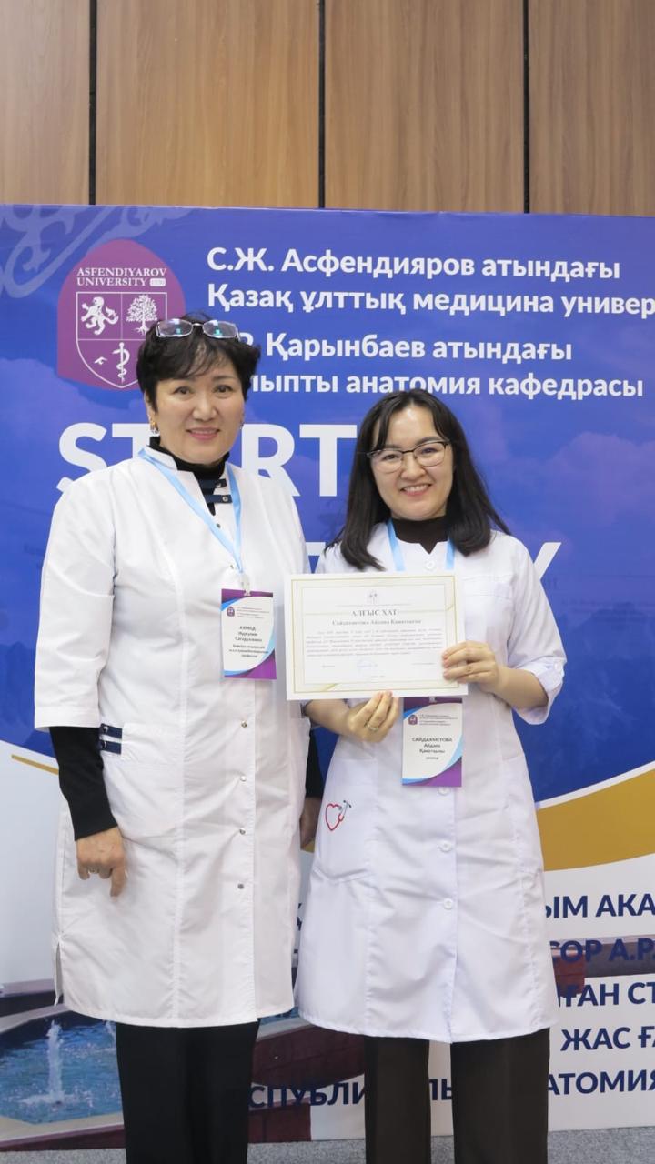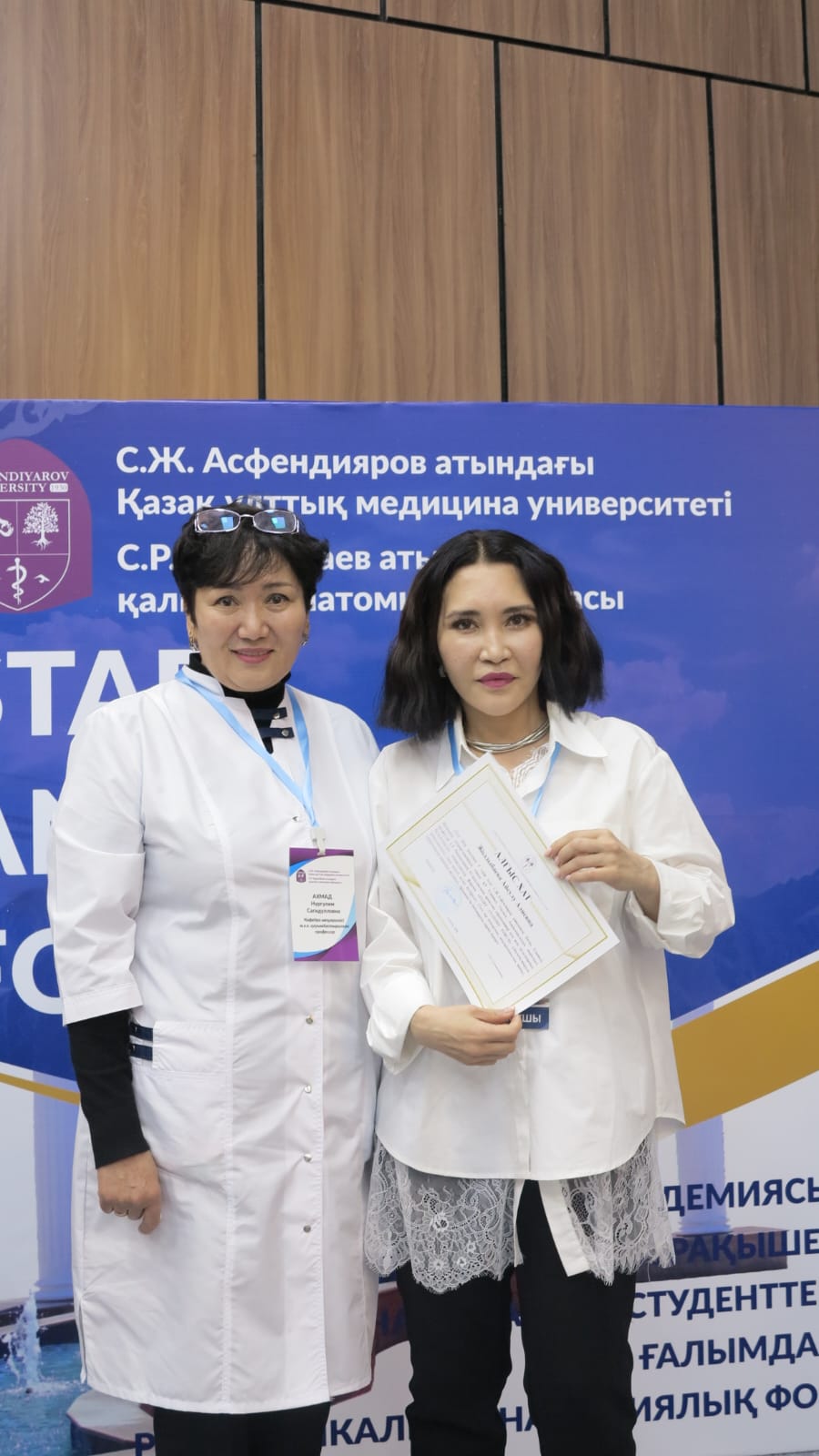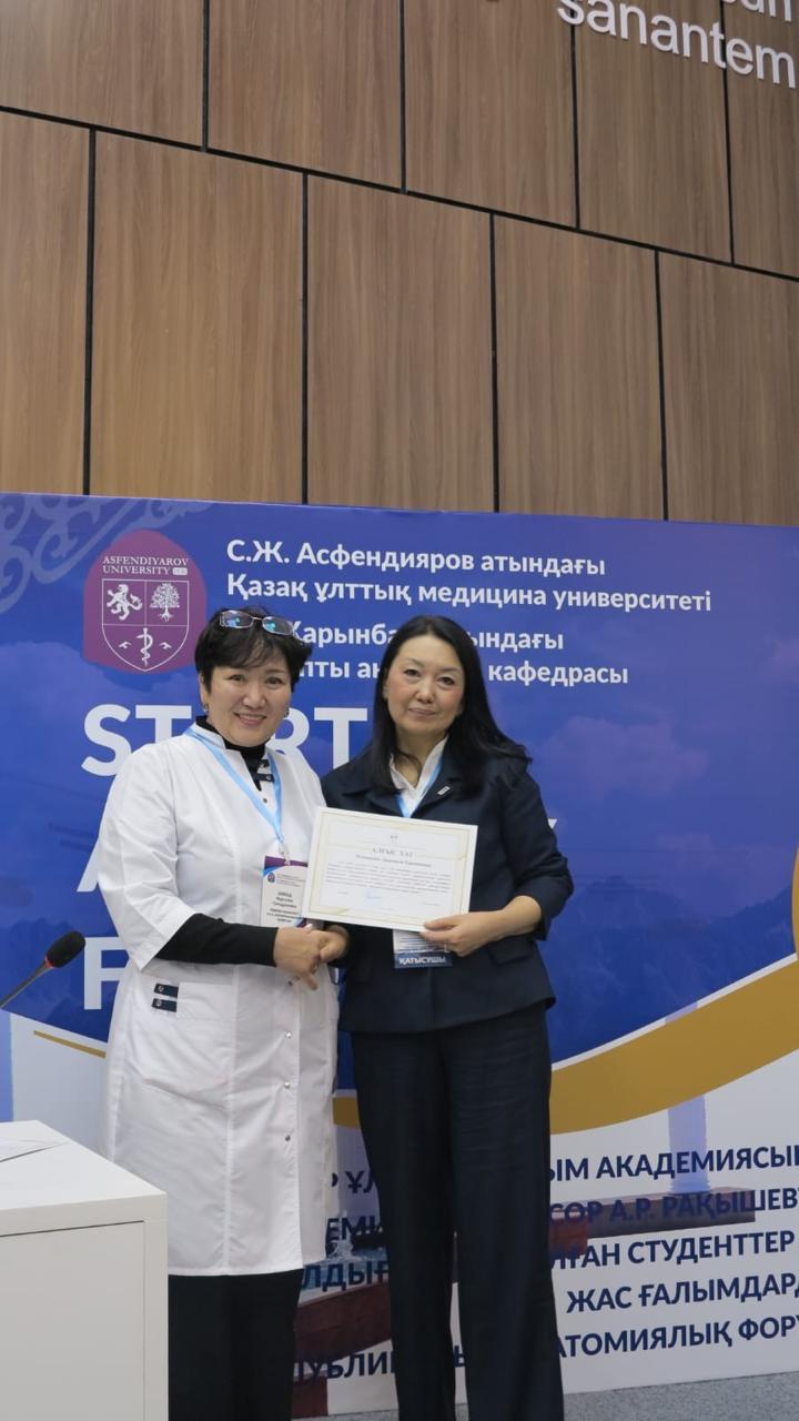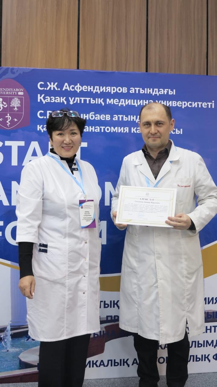 С.Р. Қарынбаев атындағы қалыпты анатомия кафедрасының профессоры-Дюсембаева А.Т., С.Р. Қарынбаев атындағы қалыпты анатомия кафедрасының профессор ассистенті-Шәкенов Б.Ш.