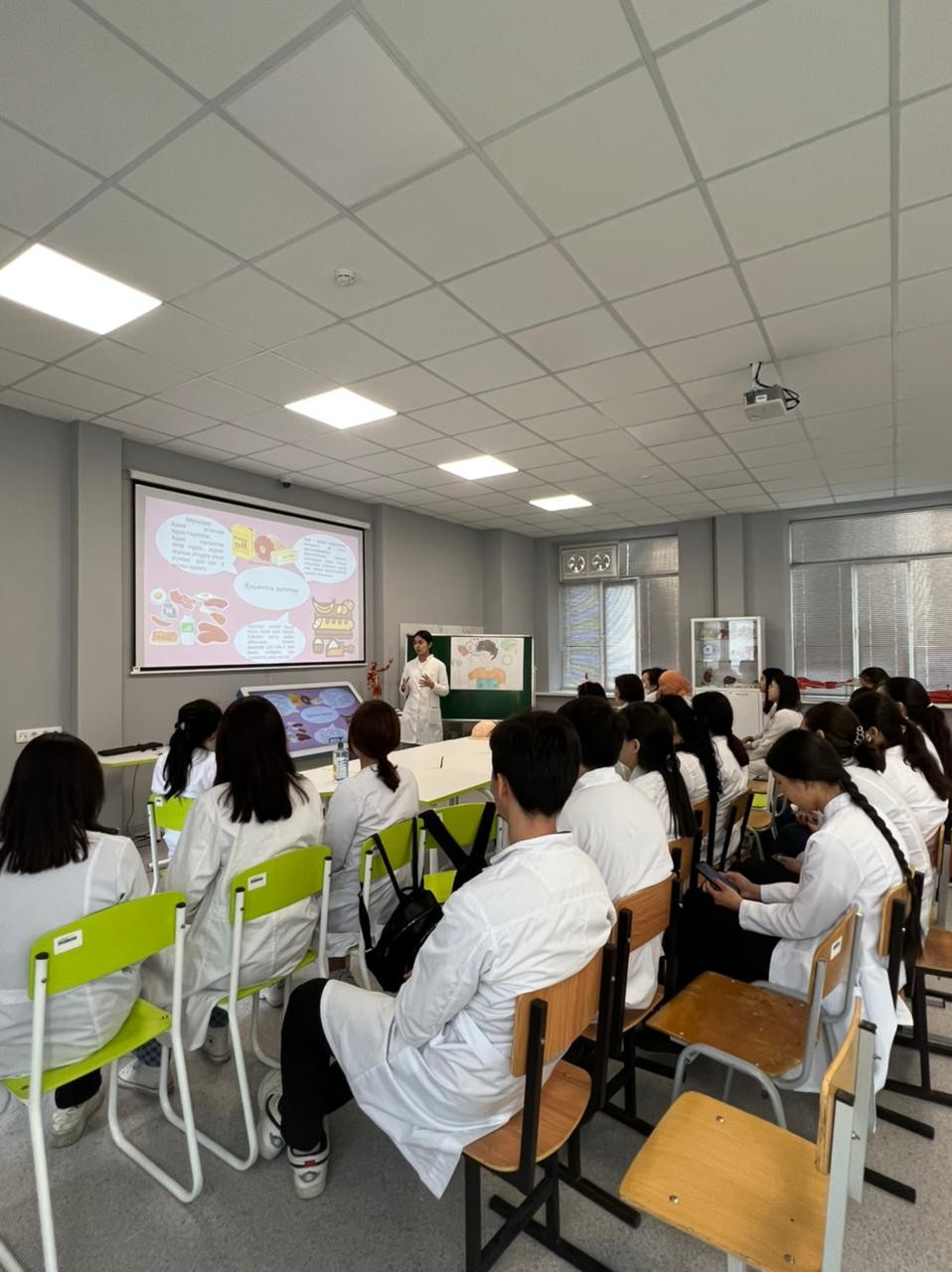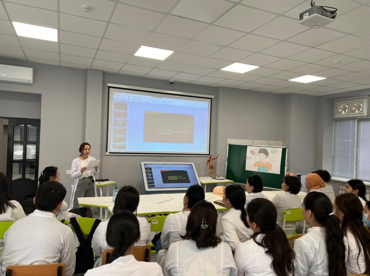 2022 жылы сәуір айының 7 күні 119 аудиторияда сағат 9.00 да Дүниежүзілік денсаулық күніне орай «Денсаулық – зор байлық» тақырыбында, 1 курс П21-003-2 тобының және 1 курс ҚДС 21-002-1; ҚДС 21-001-2 топтарының студенттерінің қатысуымен дөңгелек стөл өткізілді. Ис шараның басында аға куратор Абиырова Назым Бейсеновна өз сөзімен бастап, іс шара туралы ақпараттар беріп, іс шараның мақсатымен таныстырды. Дөңгелек стөлге кафедра ПОҚ (Ахмад Н.С., Искакова Л.А., Абиырова Н.Б., Дармен Н.Ж., Курбаниязова С.С., Келимбетова Ж.Т.) қатысты. Ис шараның мақсаты: салауатты өмір салтын насихаттау, өмір сүру ұзақтығын арттыру, дұрыс тамақтануды насихаттау болып табылады. Дөңгелек стөлде дұрыс тамақтану, оразаның пайдасы тақырыптарында презентациялар таныстырылды, викториналық сұрақтар қойылды, денсаулыққа байланысты мақал мәтелдер айтылды, сонымен қатар денсаулық сақтау мекемелерінің жұмыстары туралы да ақпараттар берілді.