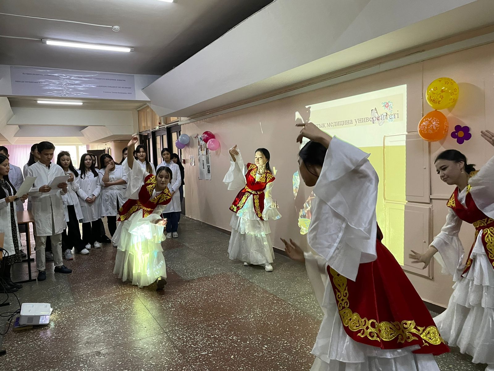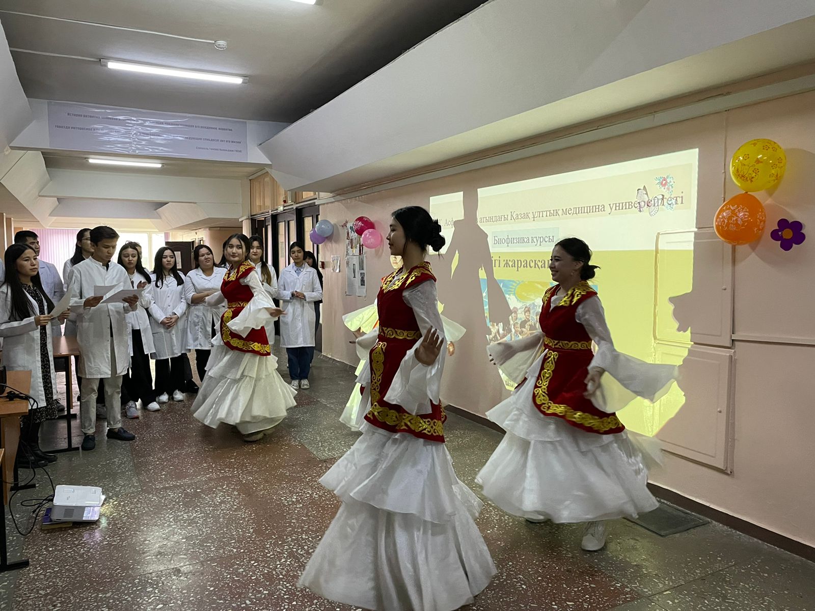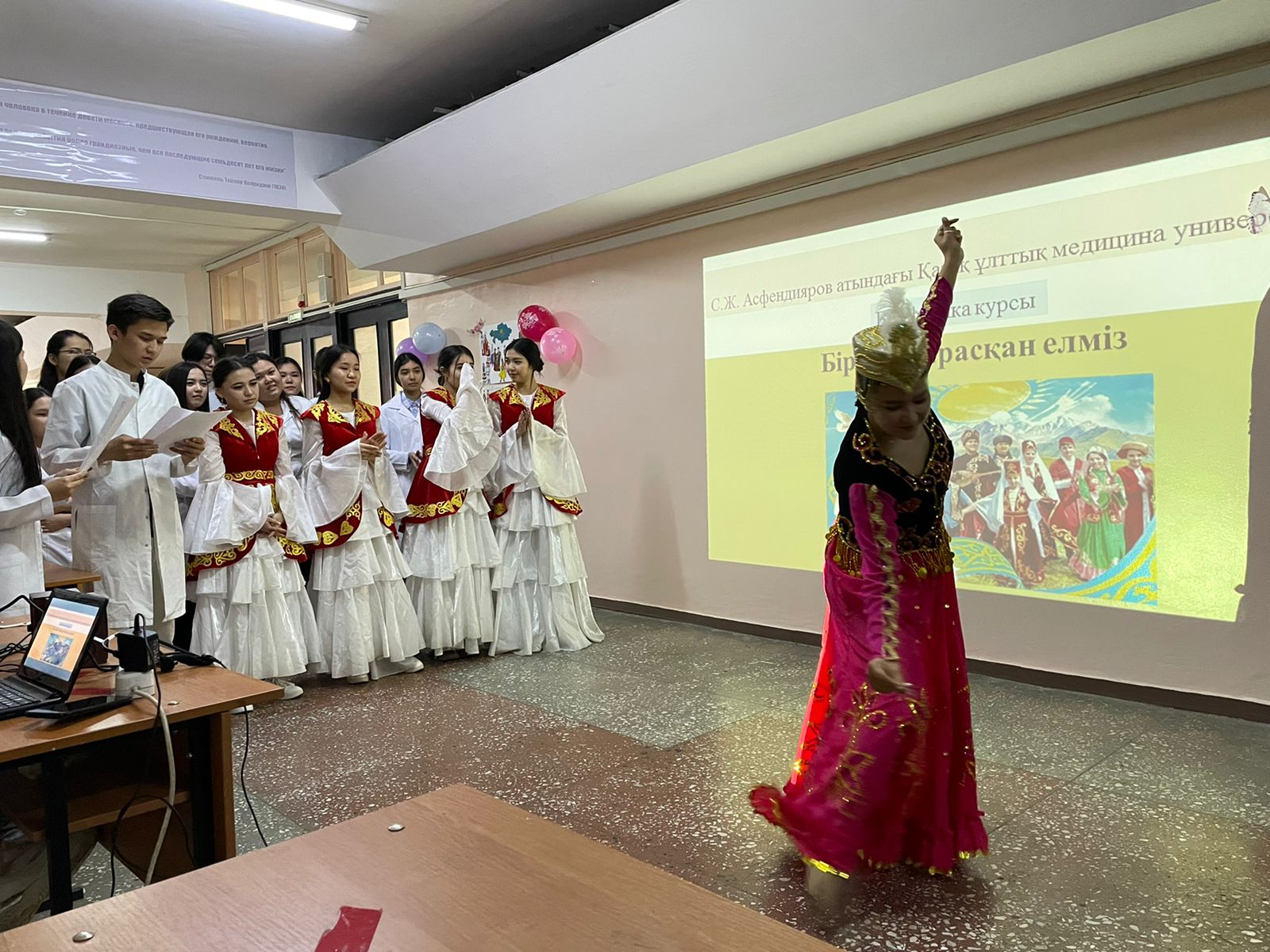 14.04.2022 күні Биофизика курсының оқытушылары Абдрасилова В.О., Нуртаева Г.К., Усипбекова Д.И. және ЖМ21-014, ЖМ21-015, ЖМ21-016 кураторлық топ студенттерінің қатысуымен ЖМ-1 мектебінің деңгейінде Қазақстан халықтарының бірлігі күніне арналған «Бірлігіміз жарасқан елміз» тақырыбында іс-шара ұйымдастырып өткізді. Жалпы медицина мектебінің декан орынбасары Маймакова Айгерім Мейрбековна студенттерге жылы лебіздер айтып, болашақтарына сәттілік тілеп іс-шараны ашып берді. Студенттердің керемет дайындығы көрермендерге және іс-шара қонақтарына өте қатты ұнады. ЖМ21-014 тобының қыздары қазақ және ұйғыр билерін биледі, күй тартылып, ән айтылды. Көрермендердің қатысуымен асық ату, ләңгі тебу, қыз қуу сияқты ұлттық ойындар ойнатылды, интерактивті форматта жұмбақталған сөздер арқылы мақал-мәтелдерді табу ойыны өте қызықты өтті.