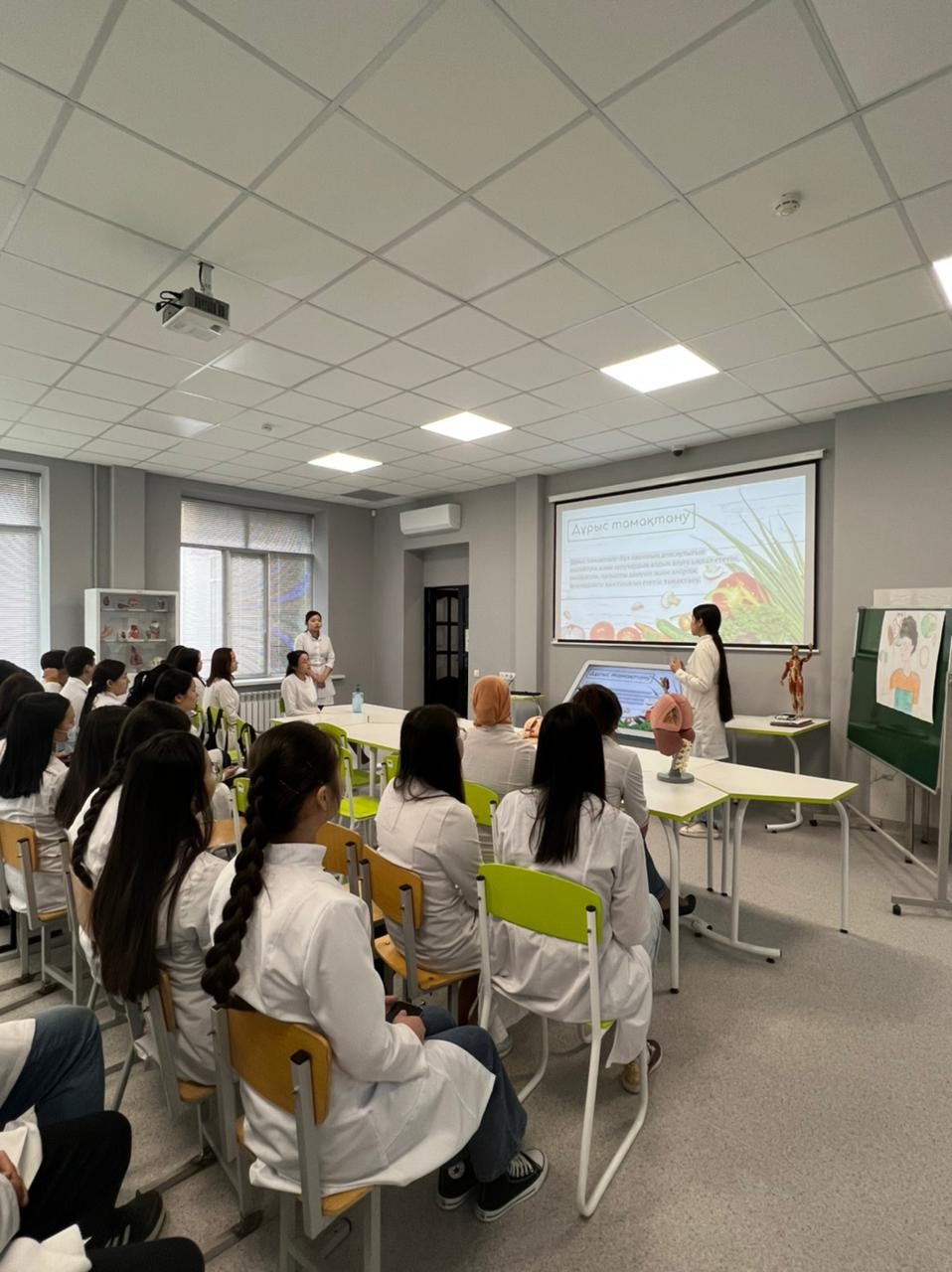 2022 жылы сәуір айының 7 күні 119 аудиторияда сағат 9.00 да Дүниежүзілік денсаулық күніне орай «Денсаулық – зор байлық» тақырыбында, 1 курс П21-003-2 тобының және 1 курс ҚДС 21-002-1; ҚДС 21-001-2 топтарының студенттерінің қатысуымен дөңгелек стөл өткізілді. Ис шараның басында аға куратор Абиырова Назым Бейсеновна өз сөзімен бастап, іс шара туралы ақпараттар беріп, іс шараның мақсатымен таныстырды. Дөңгелек стөлге кафедра ПОҚ (Ахмад Н.С., Искакова Л.А., Абиырова Н.Б., Дармен Н.Ж., Курбаниязова С.С., Келимбетова Ж.Т.) қатысты. Ис шараның мақсаты: салауатты өмір салтын насихаттау, өмір сүру ұзақтығын арттыру, дұрыс тамақтануды насихаттау болып табылады. Дөңгелек стөлде дұрыс тамақтану, оразаның пайдасы тақырыптарында презентациялар таныстырылды, викториналық сұрақтар қойылды, денсаулыққа байланысты мақал мәтелдер айтылды, сонымен қатар денсаулық сақтау мекемелерінің жұмыстары туралы да ақпараттар берілді.