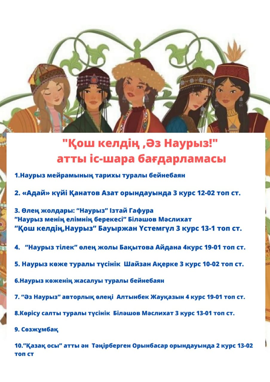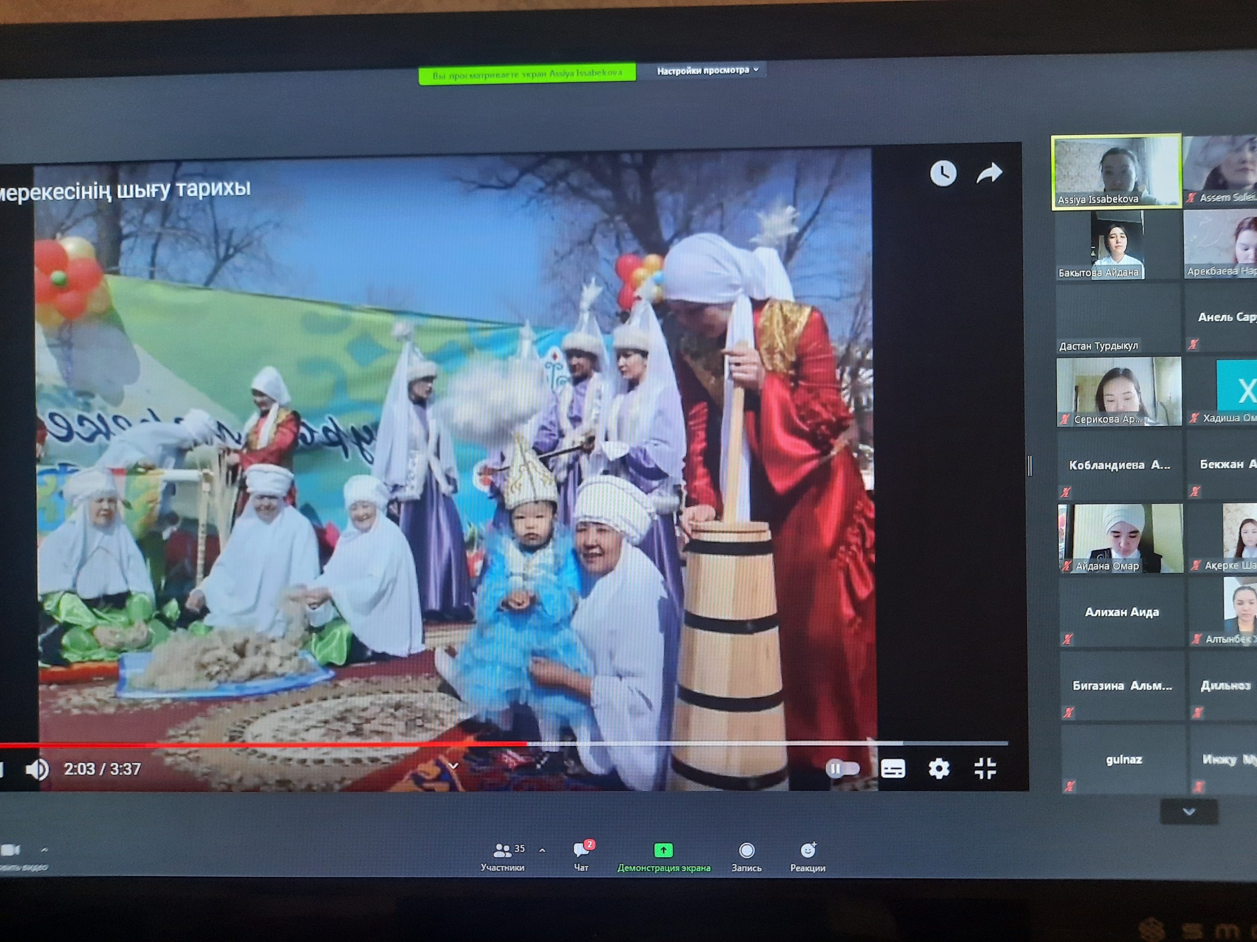 2021 жылдың 25 наурызында тәрбие жұмысына жауапты – Ішкі аурулар кафедрасының ассистенті Омарова Хадиша Сабыровна және Ішкі аурулар пропедевтикасы курсының ассистенті Сулейменова Асем Сагинтаевнаның ұйымдастыруымен және ЖМ мектебі 3 курс 12-02, 13-01, 10-02 топ студенттерінің және 4 курс 17-19-02 топ студенттерінің үлес қосып, ат салысуымен өткізілген іс-шара әрбір тыңдаушының көңілінен шықты деп ойлаймыз. Қазіргі пандемия уақытында ұлттық сана, салт-дәстүрімізден алшақтамай, ұмыт қалдырмай, осы бір тамаша көктем мейрамын студенттерімізбен бірге атап өту маңызды деп білеміз!